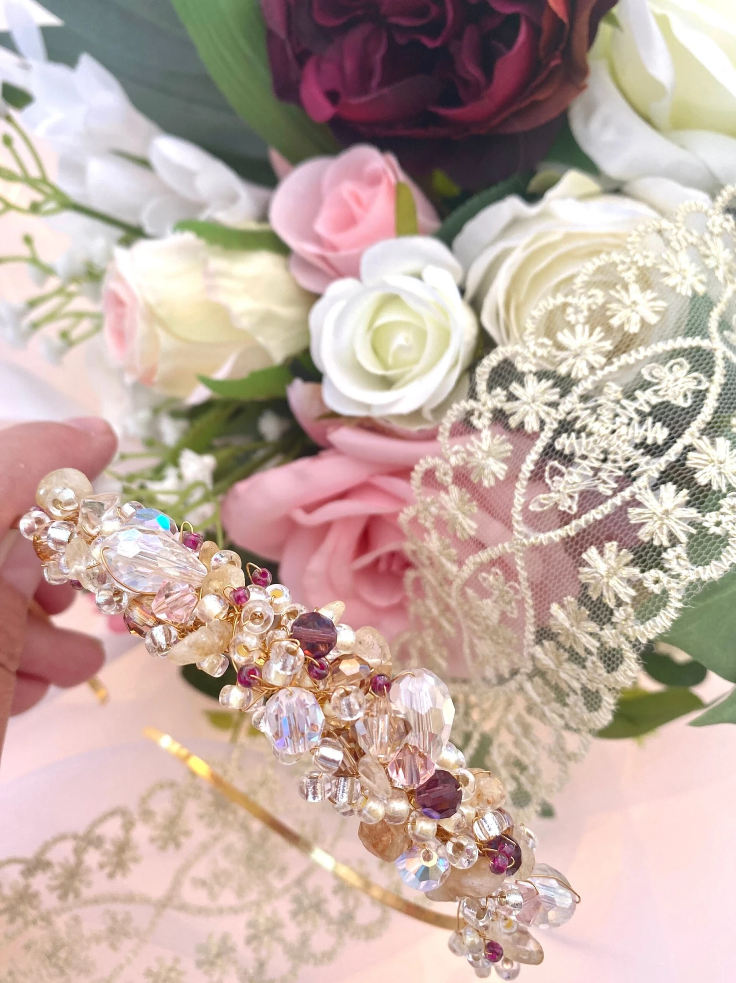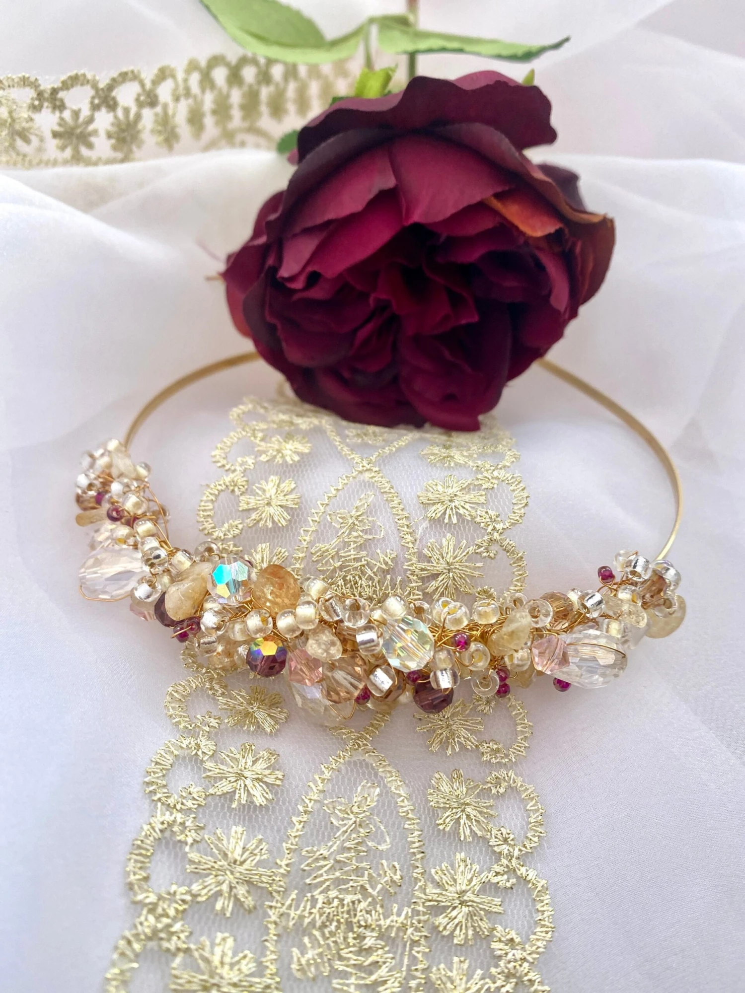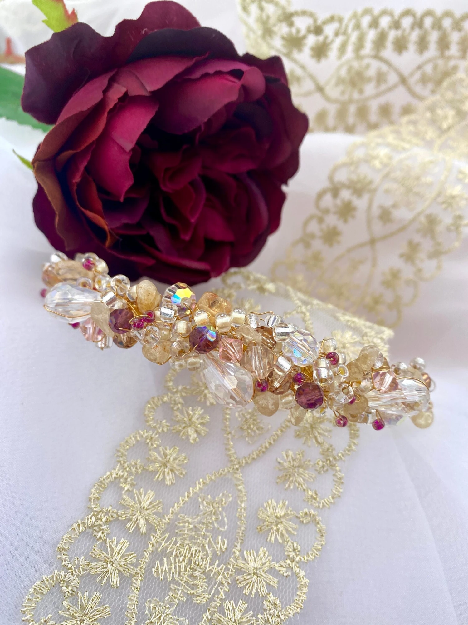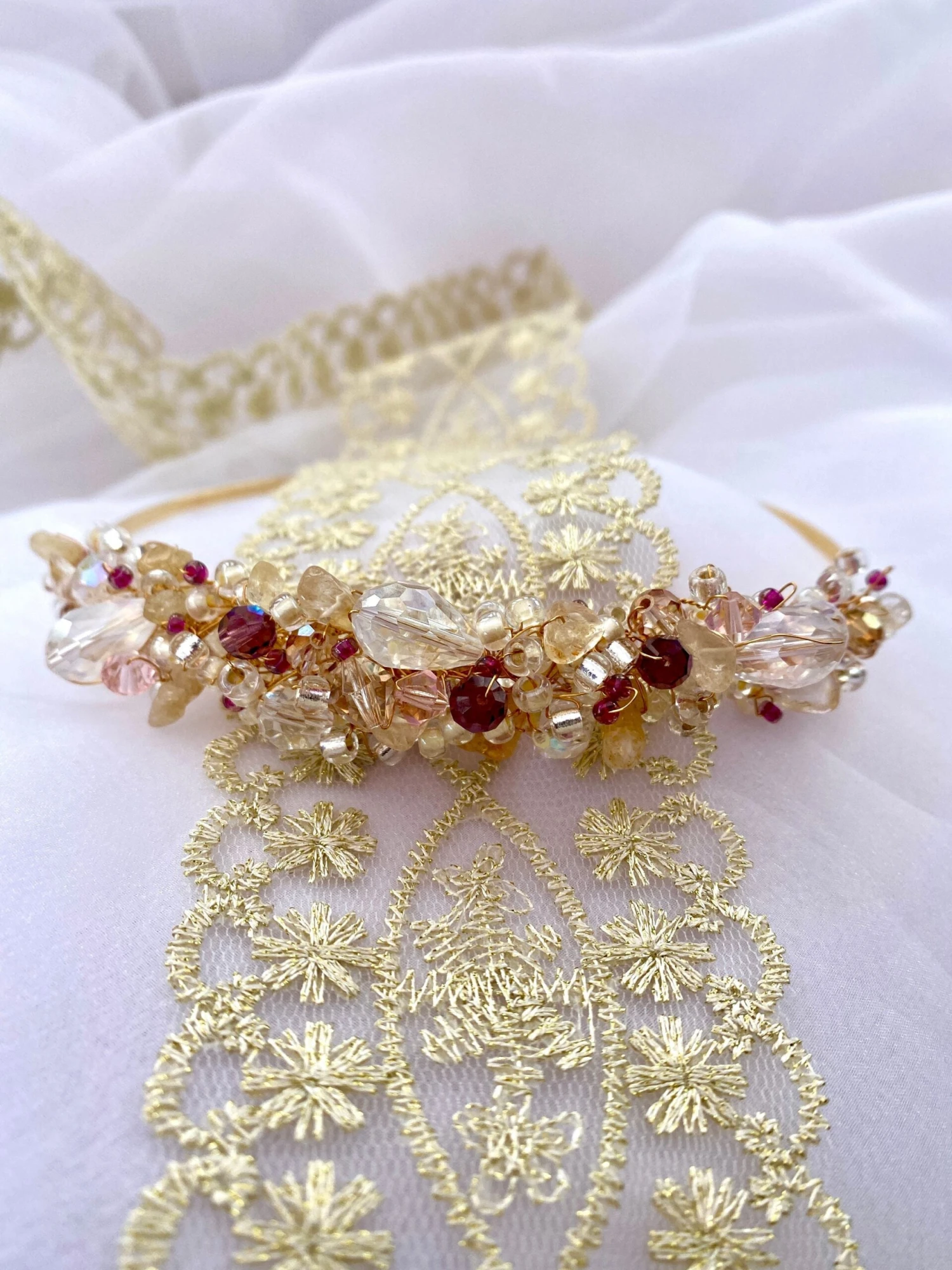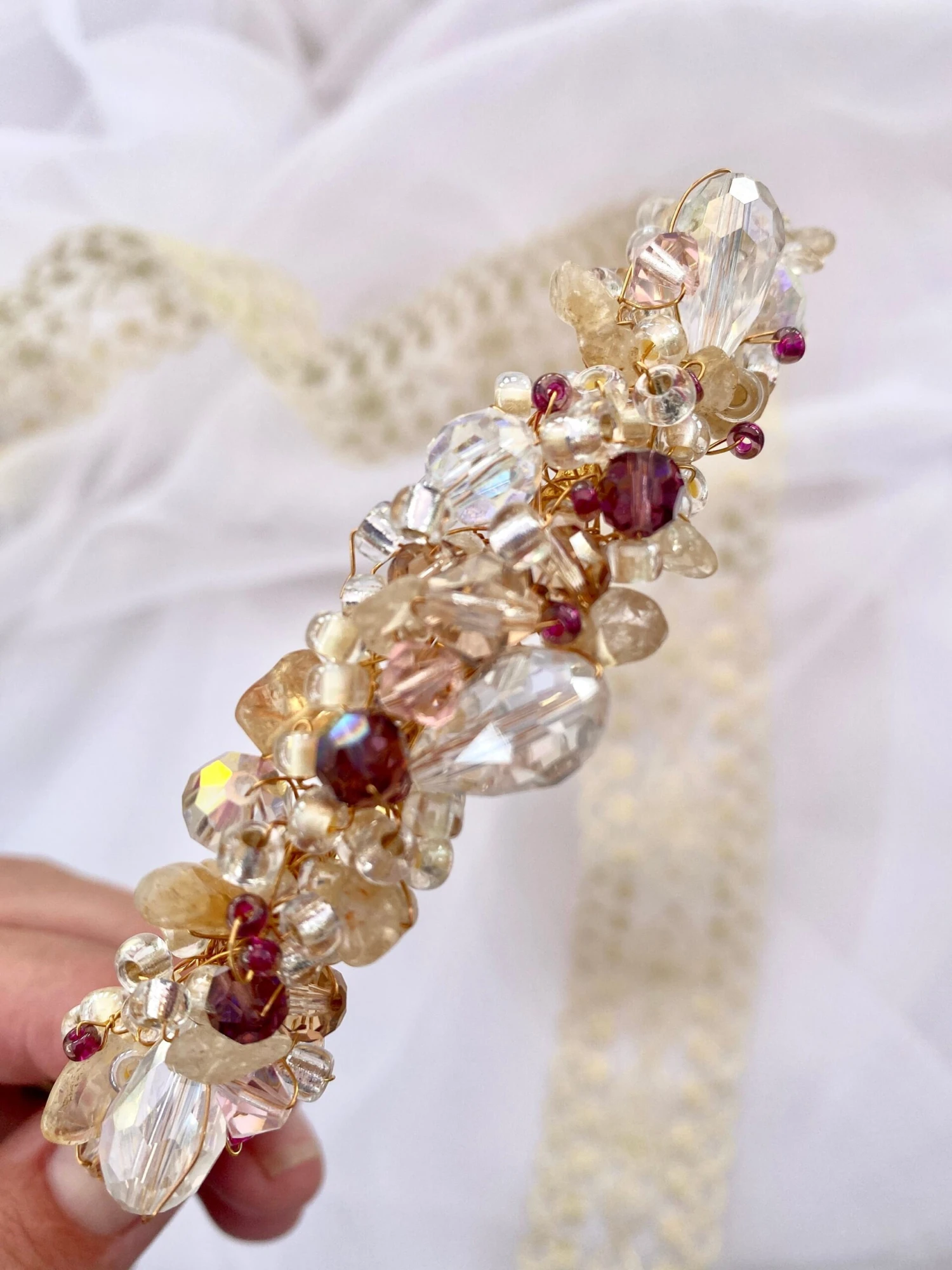 Gold bride or bridesmaid headpiece woven together with gold quartz semi precious crystal, clear Preciosa crystal, Amethyst Preciosa crystal, blush pink Preciosa crystal on a golden wire frame. The ‘Ivy’ crystal headdress would look beautiful as a wedding bridal headpiece, for a Christmas, autumn or winter wedding, a stunning headpiece for a wedding guest, a party headdress or ‘just because’!!!