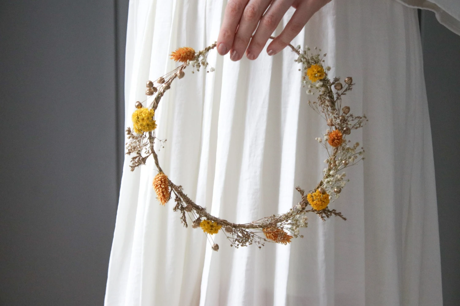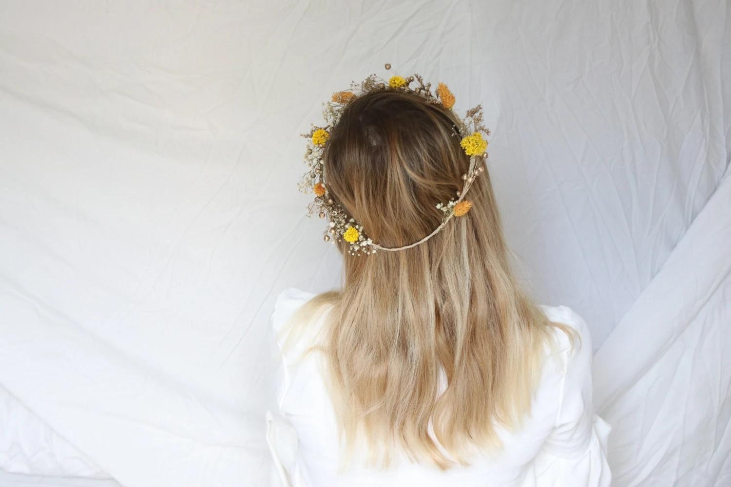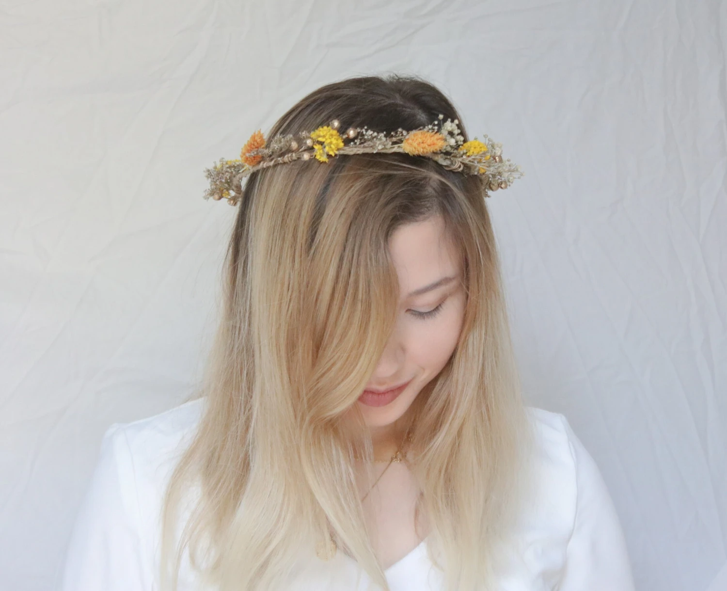 This flower crown exudes all the best elements of nature with dried canary grass, flax seed pods, and broom blooms weaved together. It looks simple yet elegant, adding a floral touch to brides, bridesmaids, and flower girls—a perfect for a bohemian look for a festival or party.