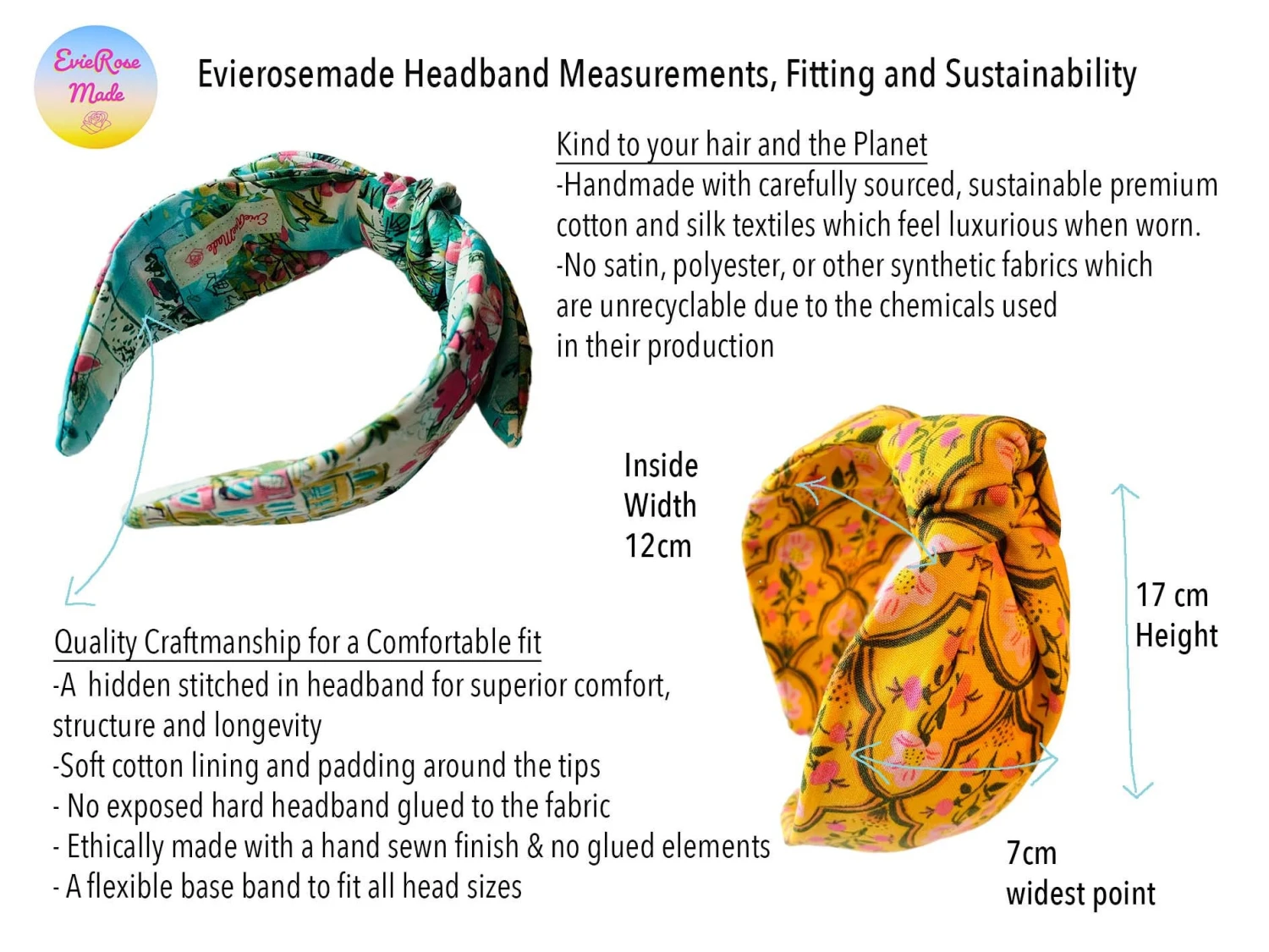 All of my headbands are made using a very flexible Alice band suitable for all head sizes. Unlike other headbands my beautiful fabrics are not glued to a visible, covered or uncovered base band. They are carefully and sustainably made with the base band sewn into the headband with soft padding for extra structure, longevity and for all day comfort, without the band digging in.