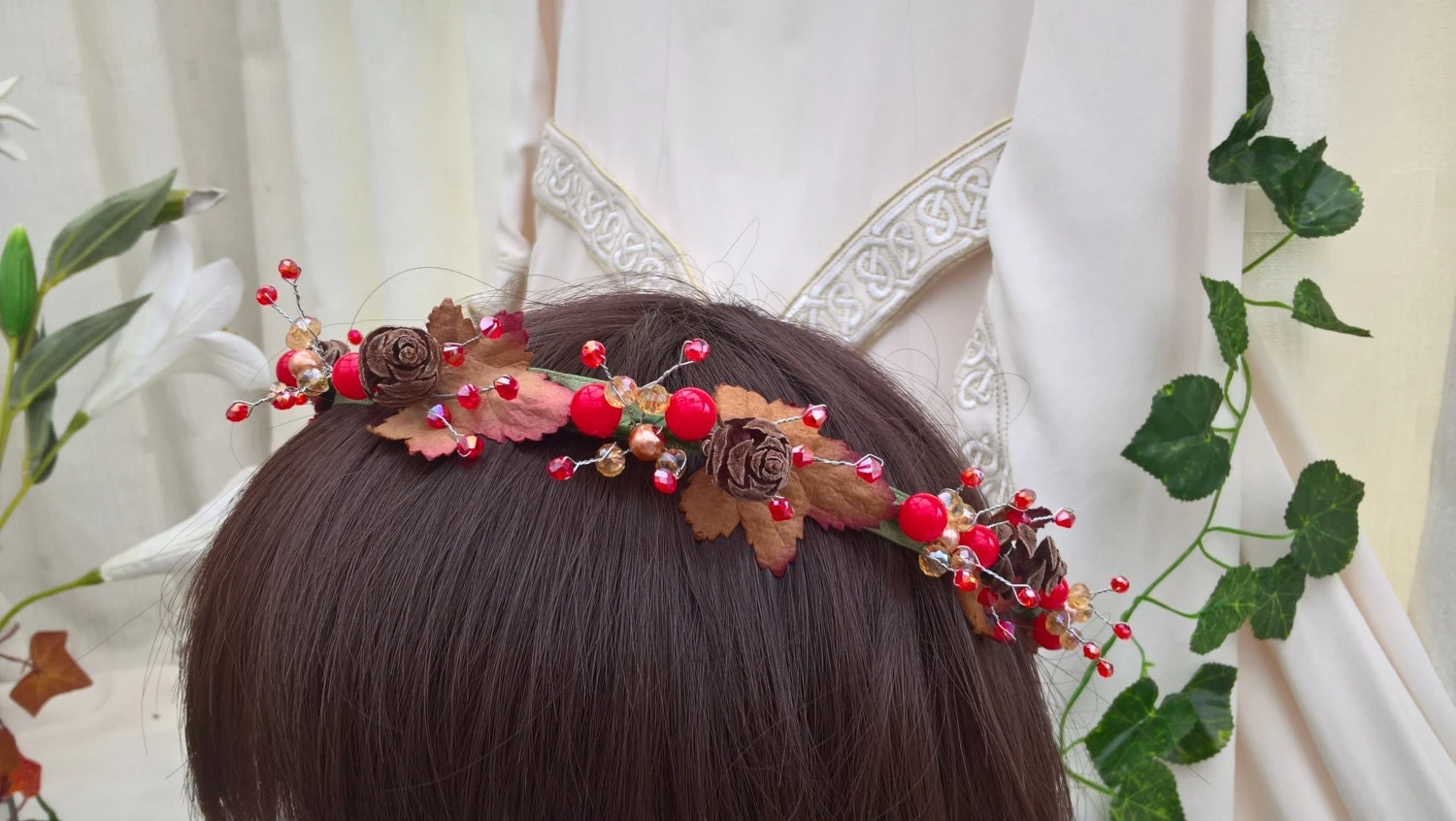 christmas berry headdress, beautiful headband that is suitable for weddings or festivals, consists of artificial berries,peach, red crystals, mulberry leaves and acacia seed pods. Will fit any size head. Fastens at the back with ribbons.