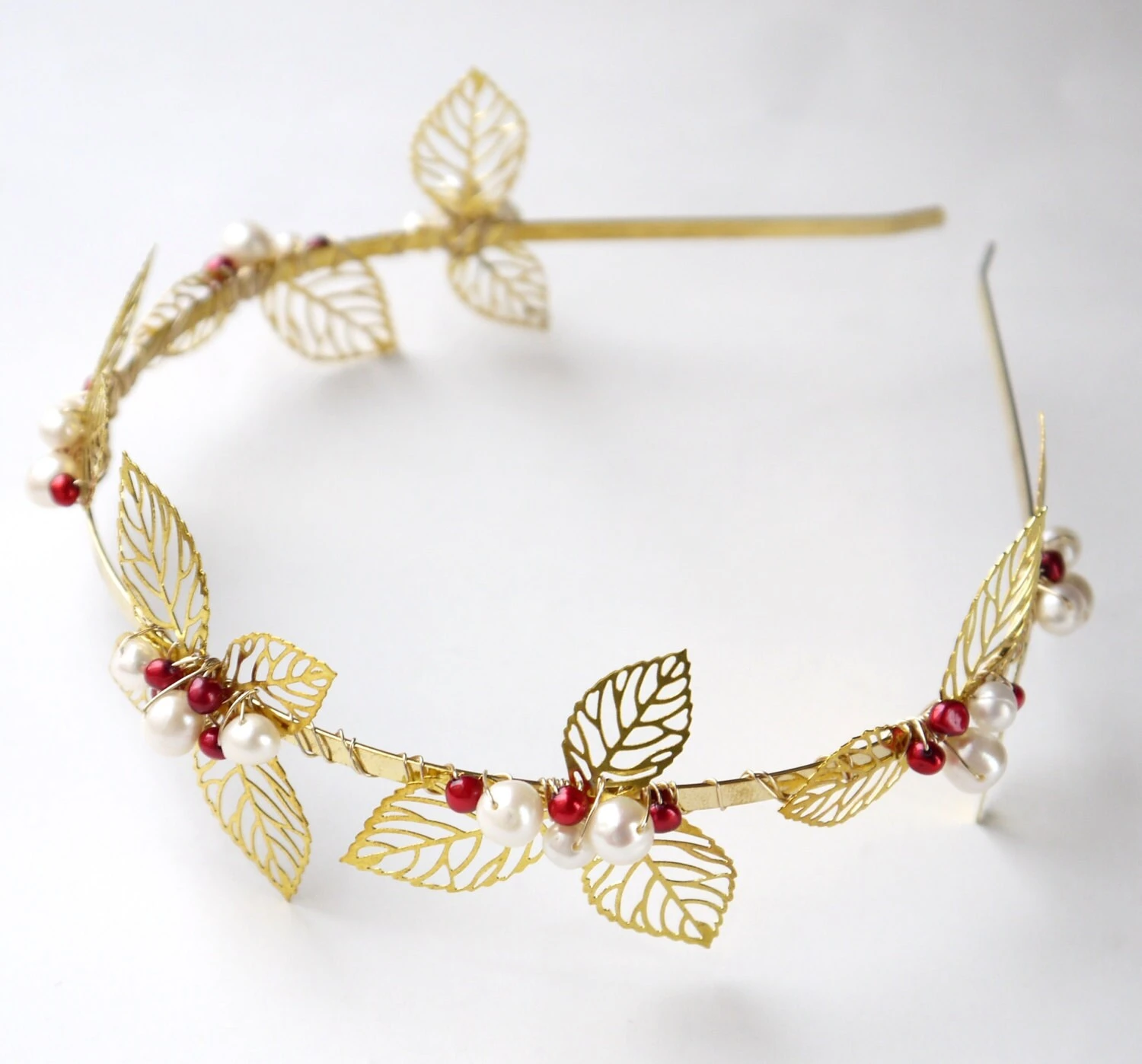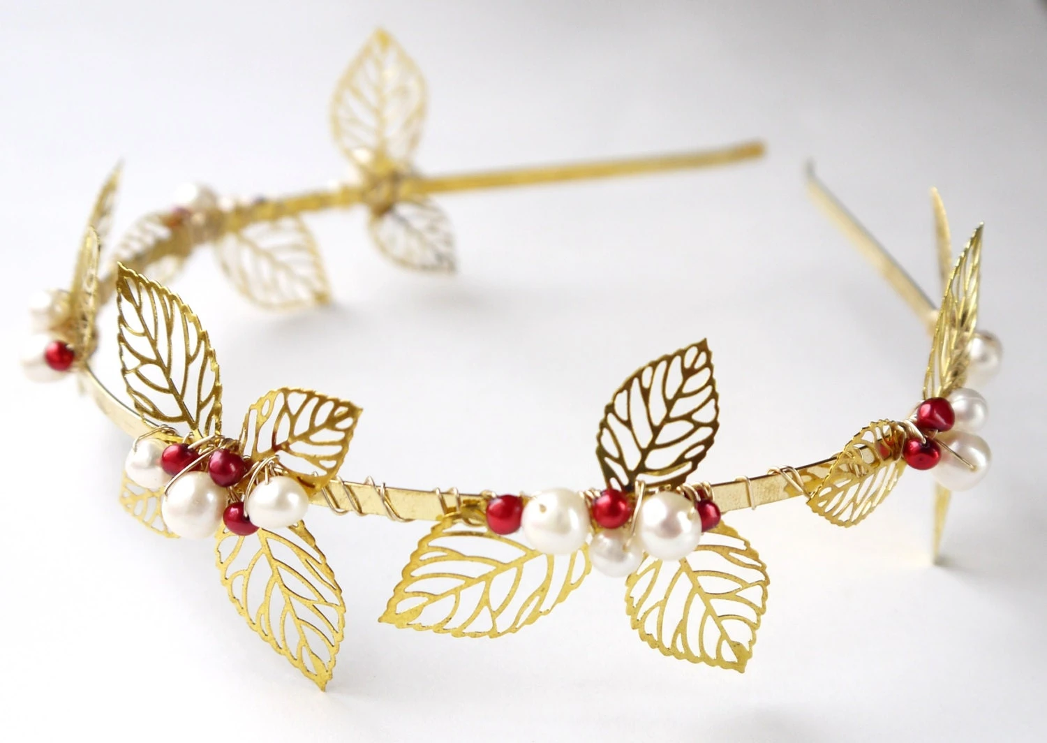 Inspired by Christmas, this is a full wreath of delicate gold filigree leaves woven with small clusters of genuine red and white pearls on a gold tiara band.
