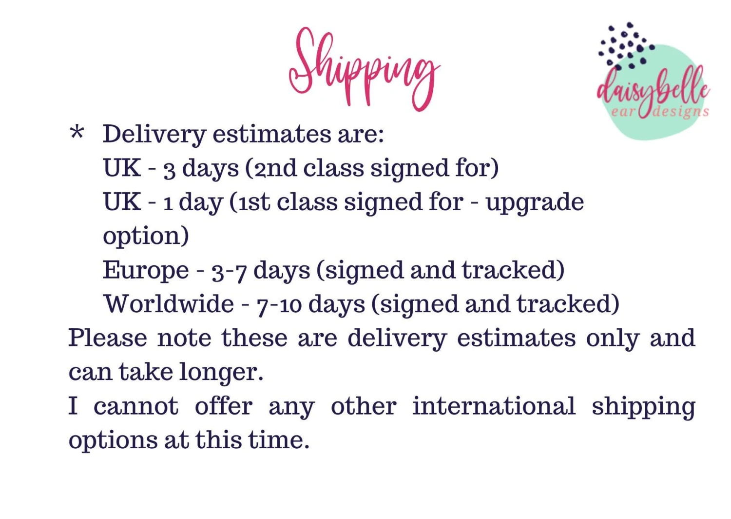 Sign up to the newsletter at https://www.daisybelleears.co.uk/pages/become-a-daisybelle-ear-designs-vip to receive a 15% discount code on your next purchase and information on new releases, upcoming sales, further discounts and deals including exclusive pairs only available on the website.Be sure to read my full item descriptions, shop announcement and shop policies, where youâll find answers to lots of common questions before purchasing.