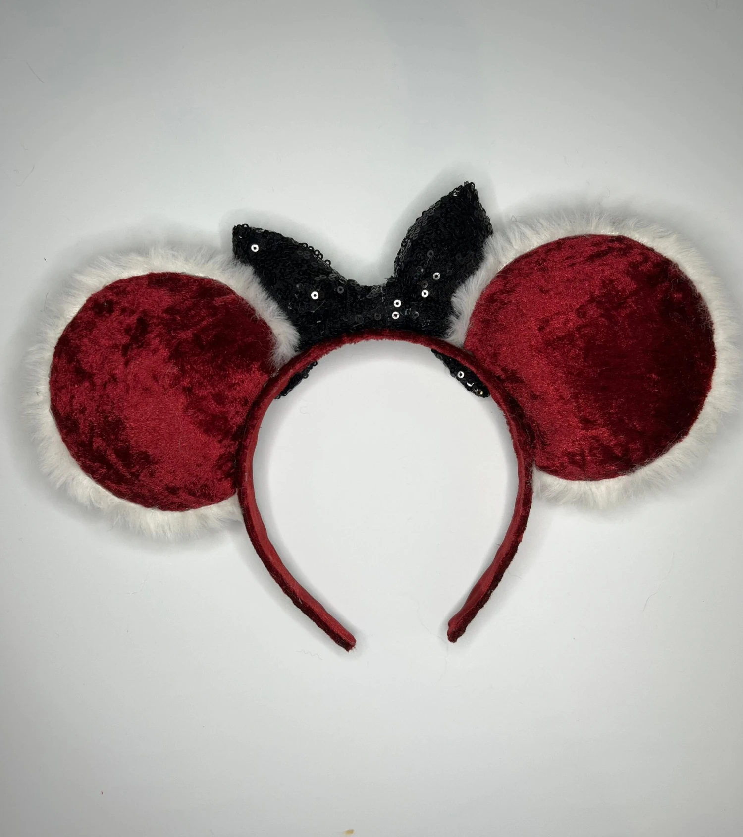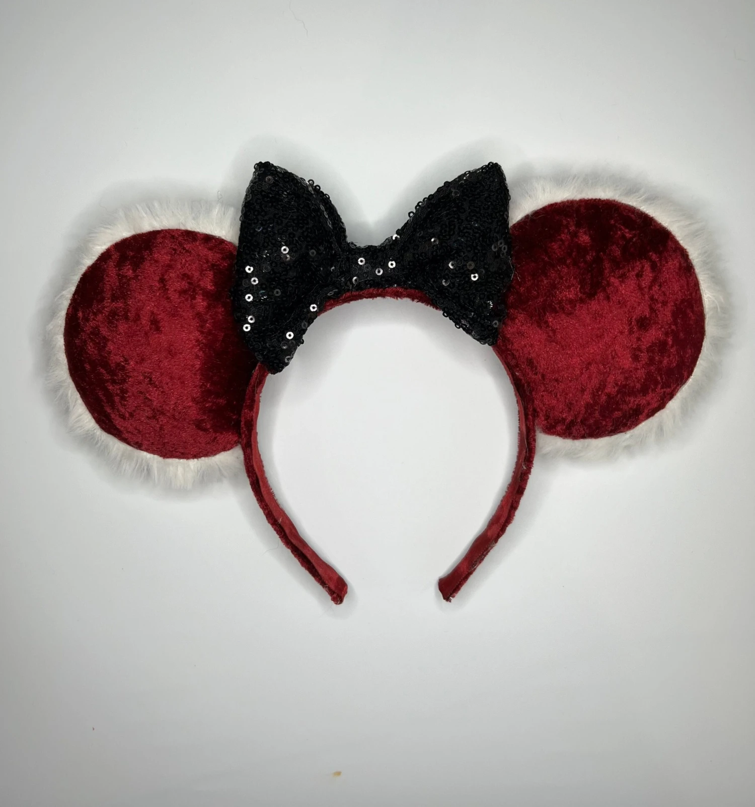 Red velvet fabric with fluffy white edging and a beautiful black sequin bow. You can choose to have with or without the sprig of holly but we think it finishes the look beautifully 😍