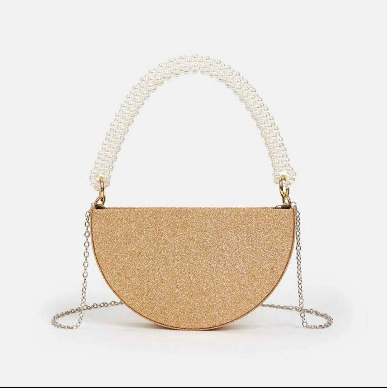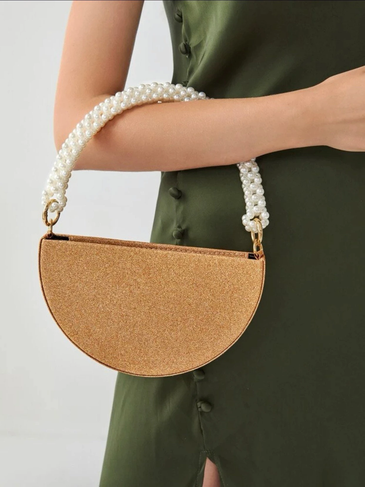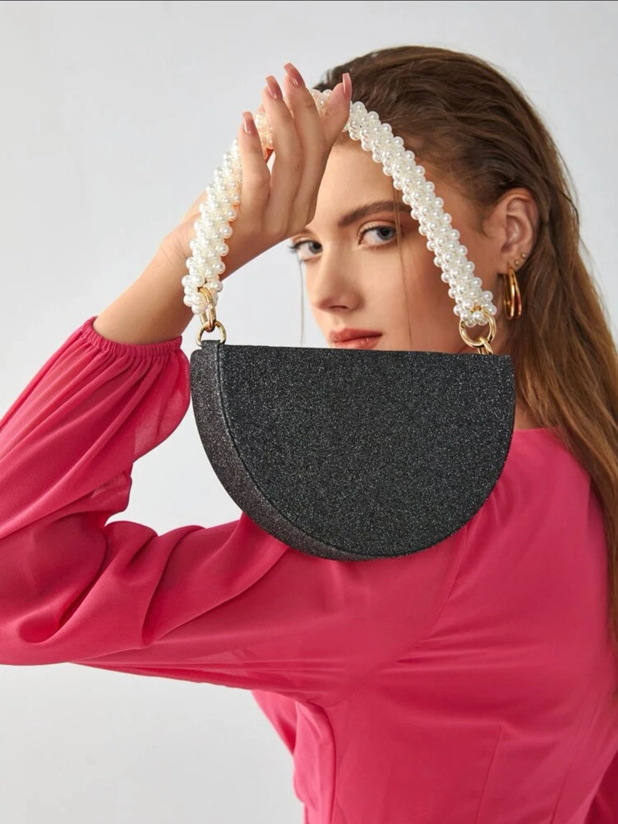 A circle glitter effect clutch bag/ evening bag/ handbag, with a faux pearl design handle. Available in gold and black.