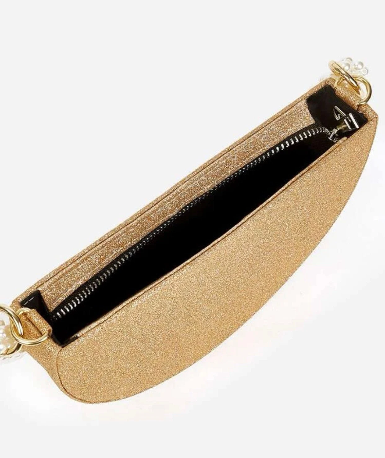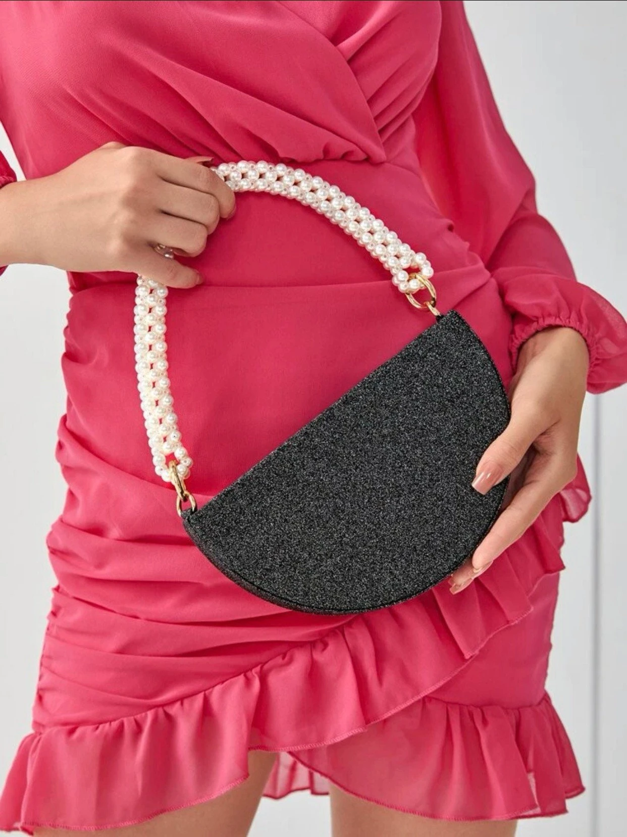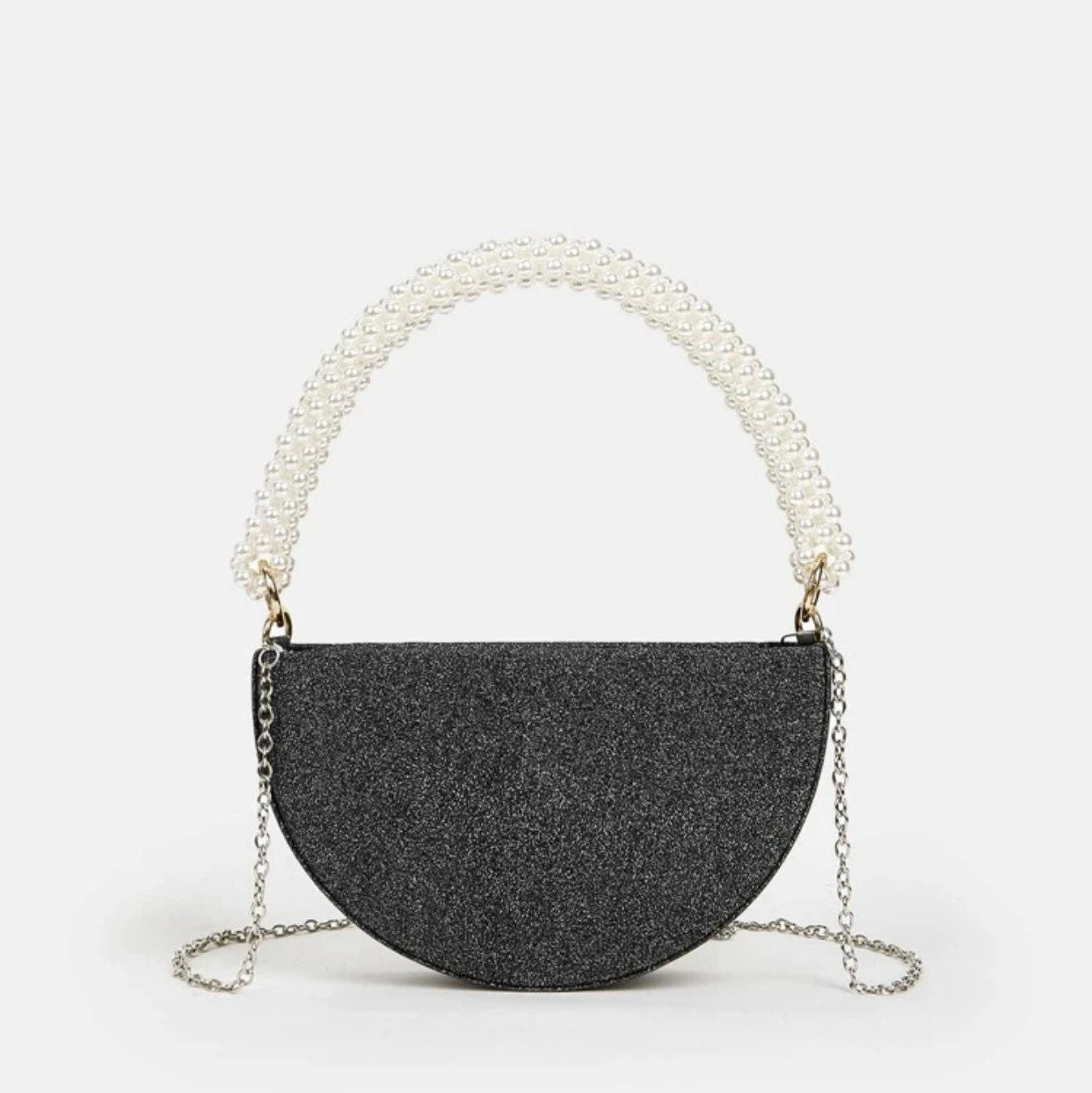 A circle glitter effect clutch bag/ evening bag/ handbag, with a faux pearl design handle. Available in gold and black.