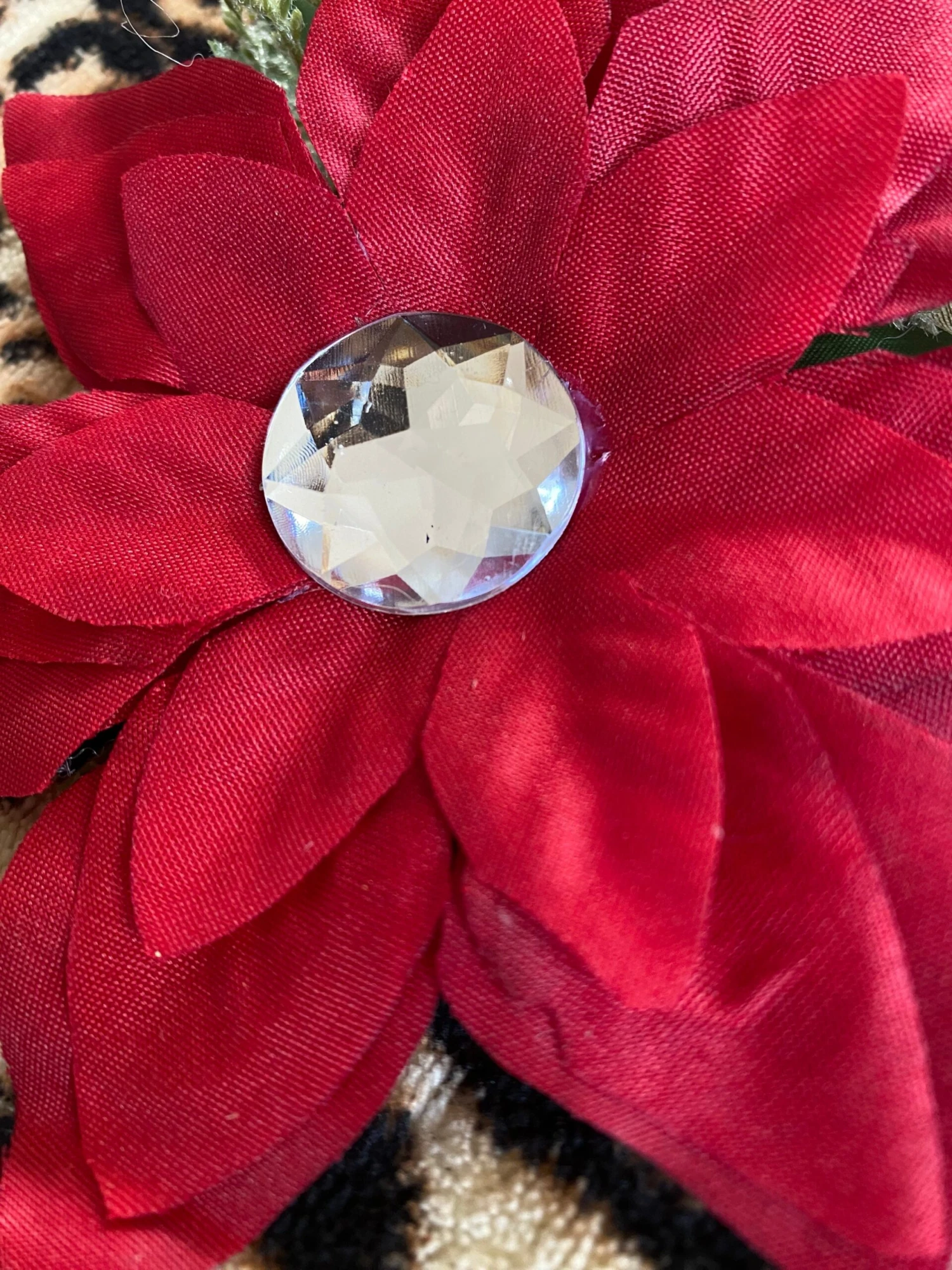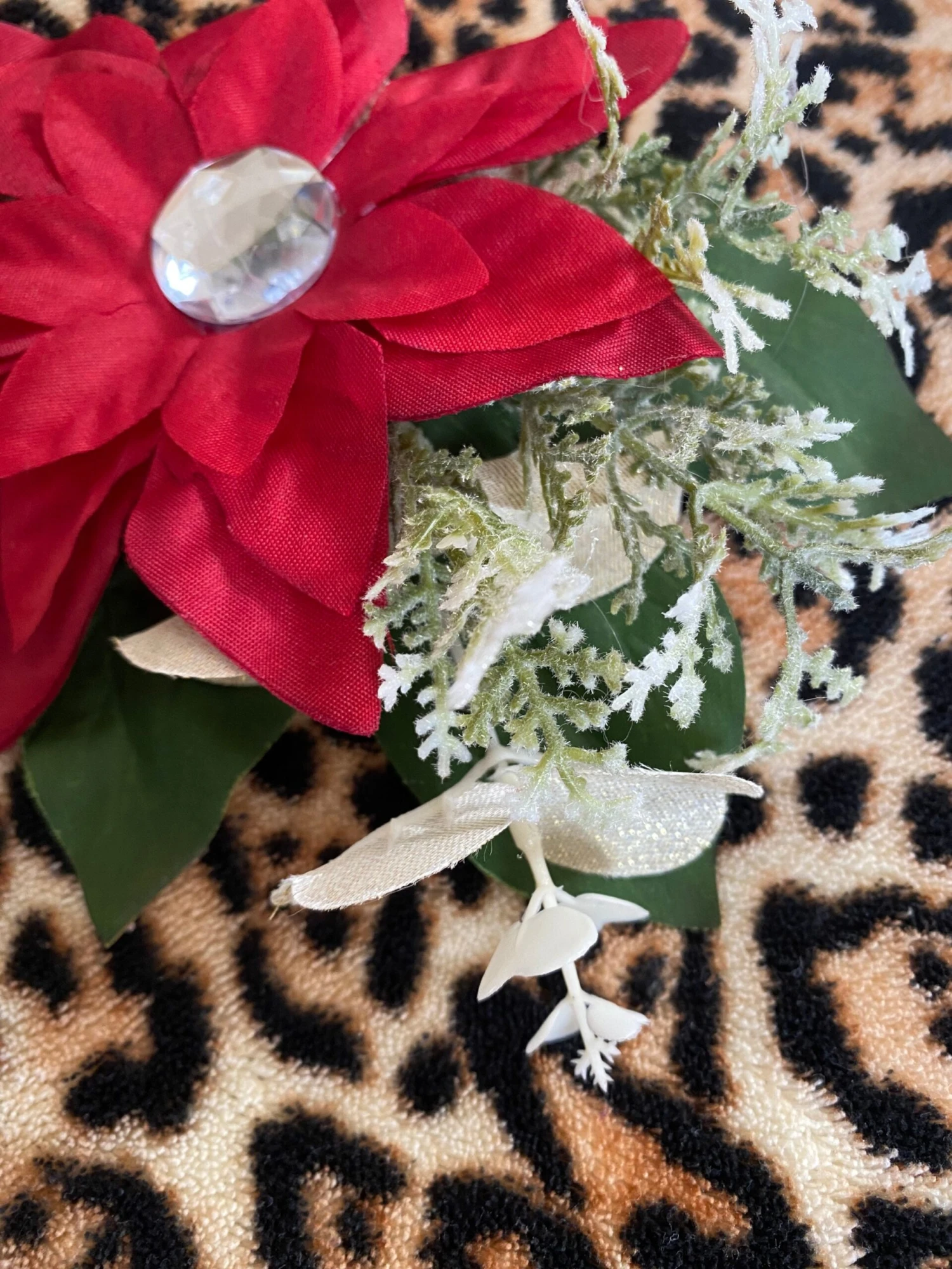 Festive & Glam Poinsettia ❤️ I have set this festive beauty on a green leaf with shimmering cream Eucalyptus and a ‘snow’ dusted foliage sprig for contrast. In the centre of the flower I have added a sparkly silver faceted bead for some Christmas sparkle. All my flowers feature a dual fastening making this a super versatile accessory; pin it in your hair or wear as winter corsage on your favourite winter coat or bag.