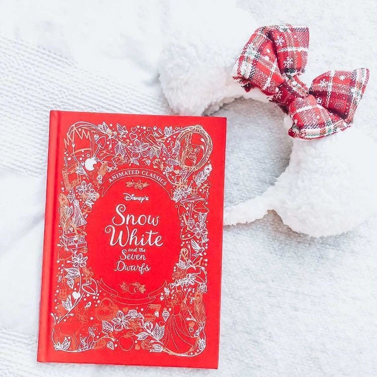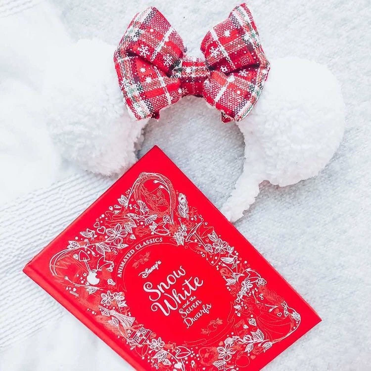 Fluffy white sherpa mouse ears with a tartan bow with snowflake detailing.