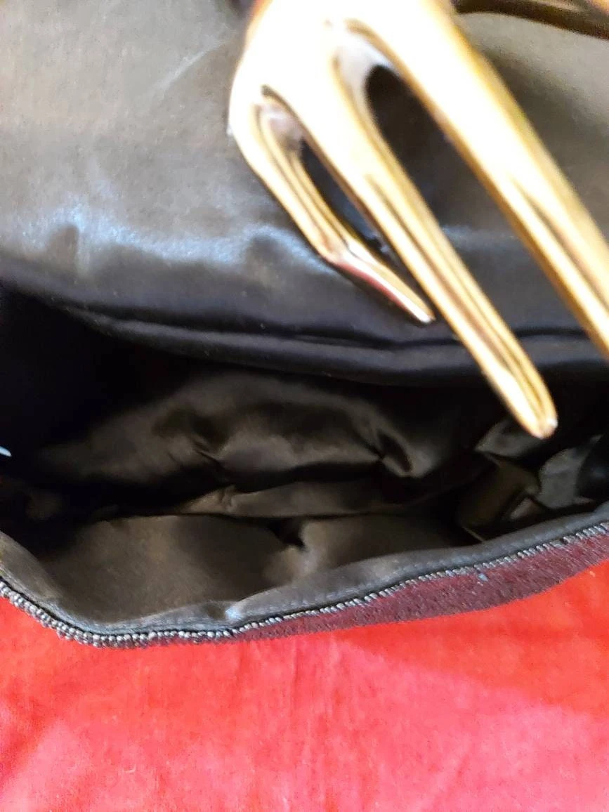 It fastens with a simple press clasp and opens to reveal a black fabric interior which is in excellent condition with no signs of wear.