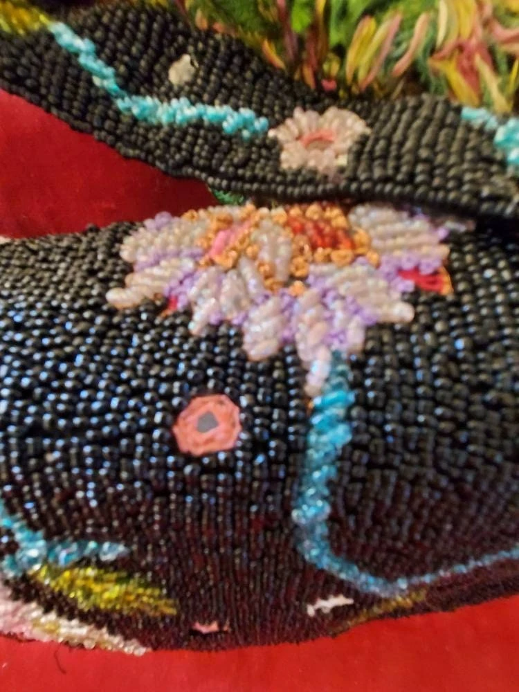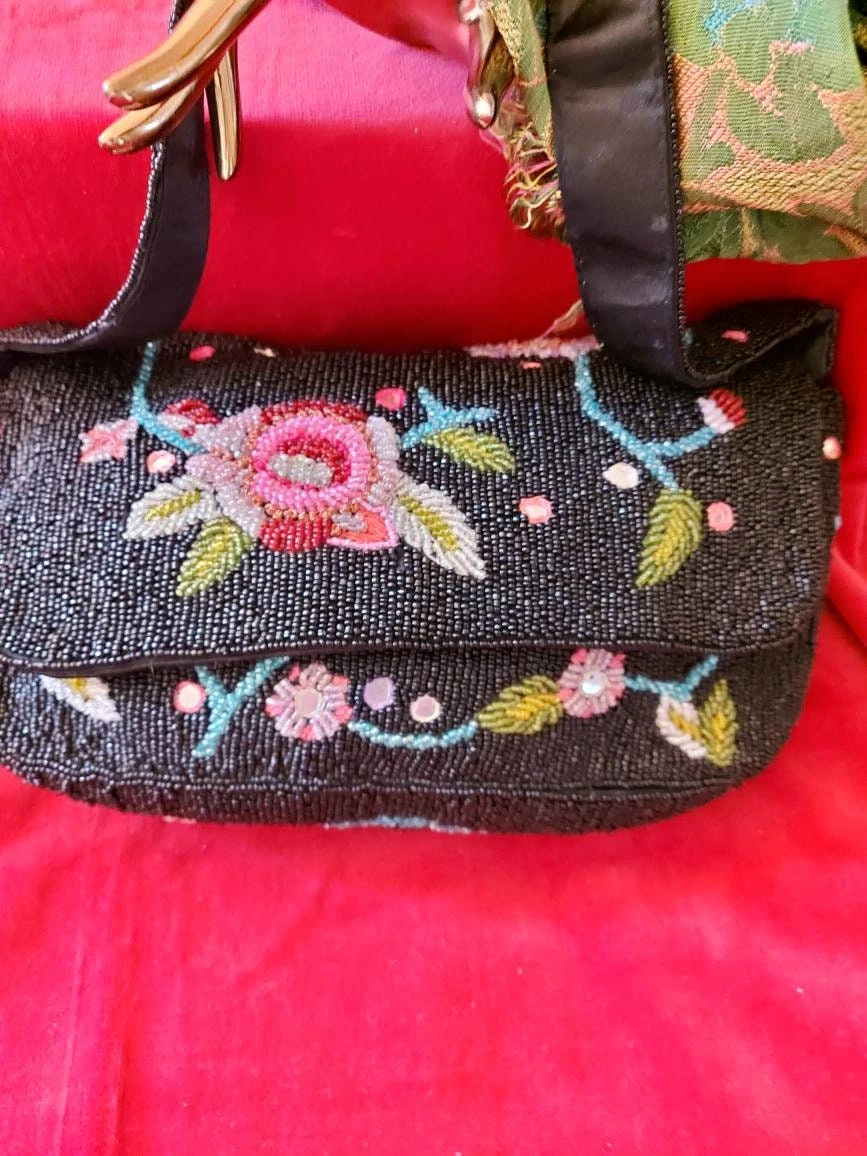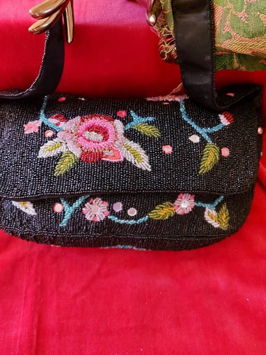 This is an absolutely gorgeous handmade vintage bag, the outer is cotton which is heavily beaded with tiny micro beads with a black background and pink, blue and green flowers .