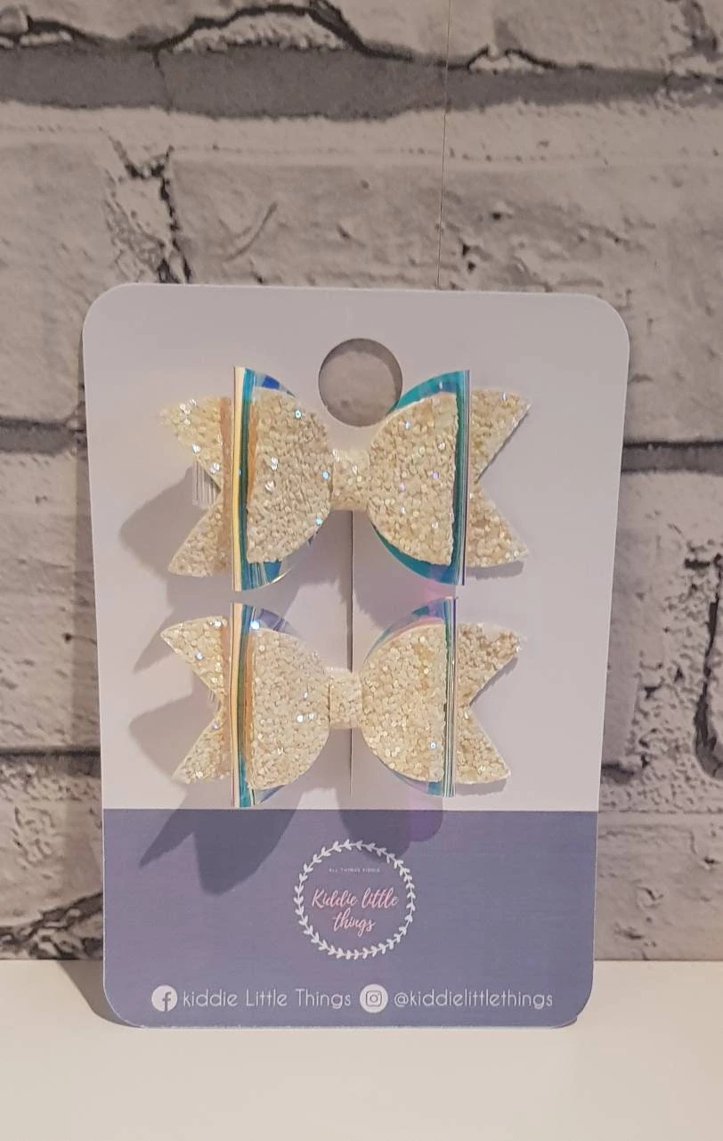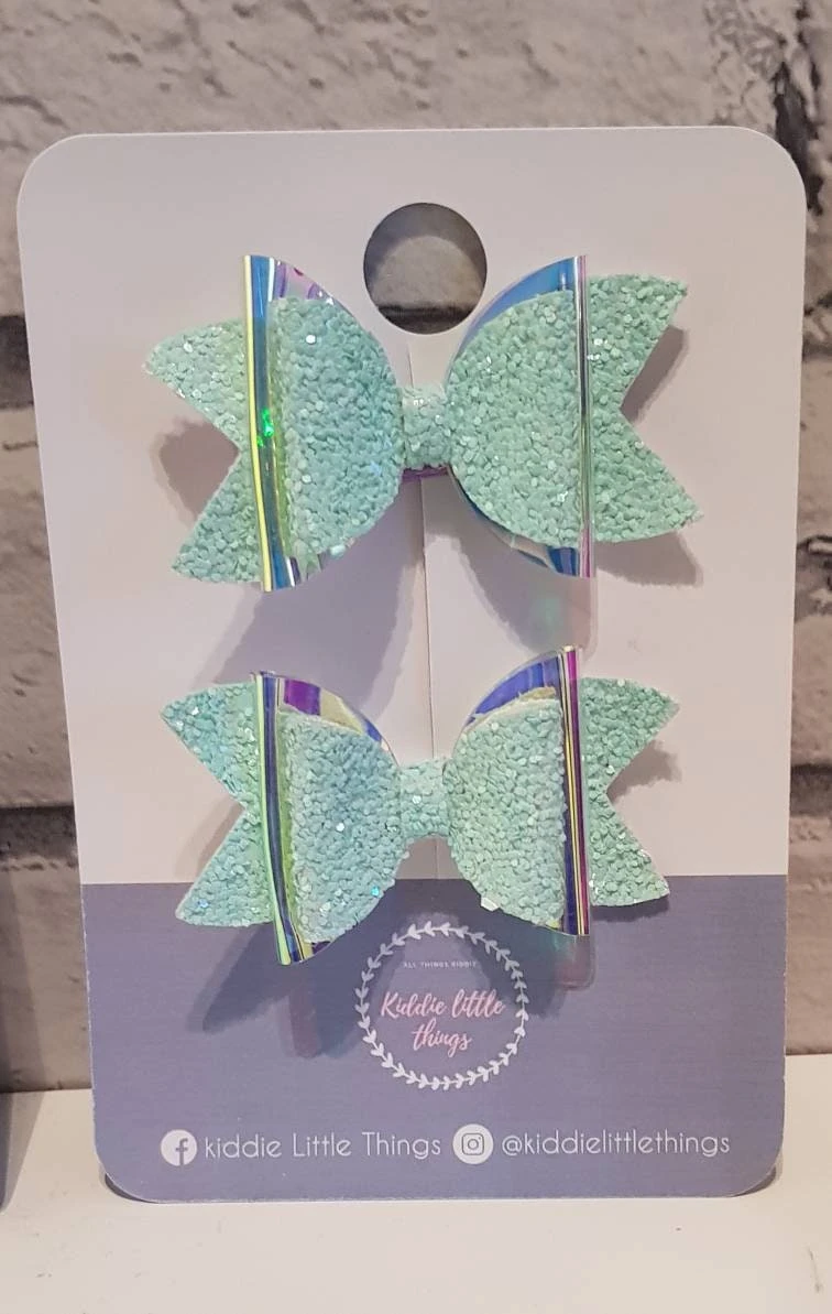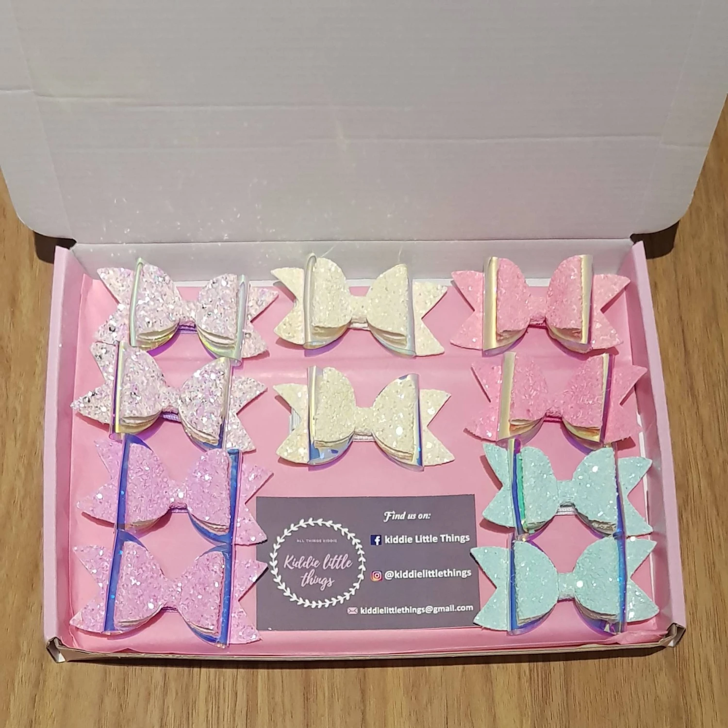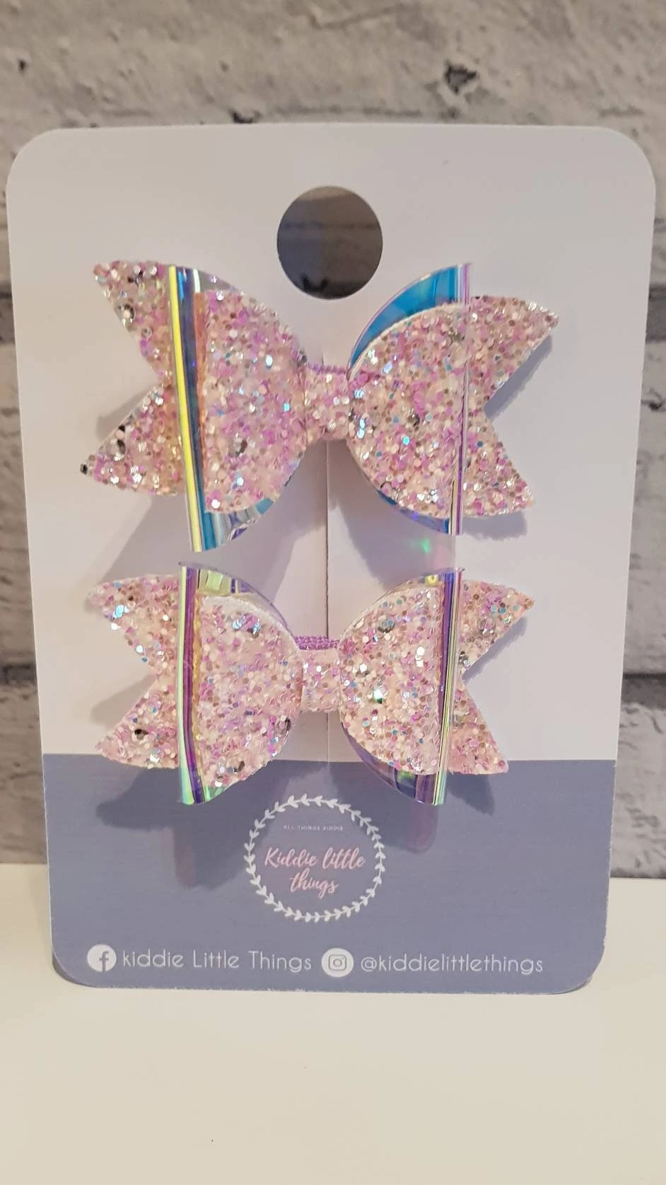 This set includes 5 pairs of matching pigtail bows. The bows are are 2.5 inches in size on an alligator clip.