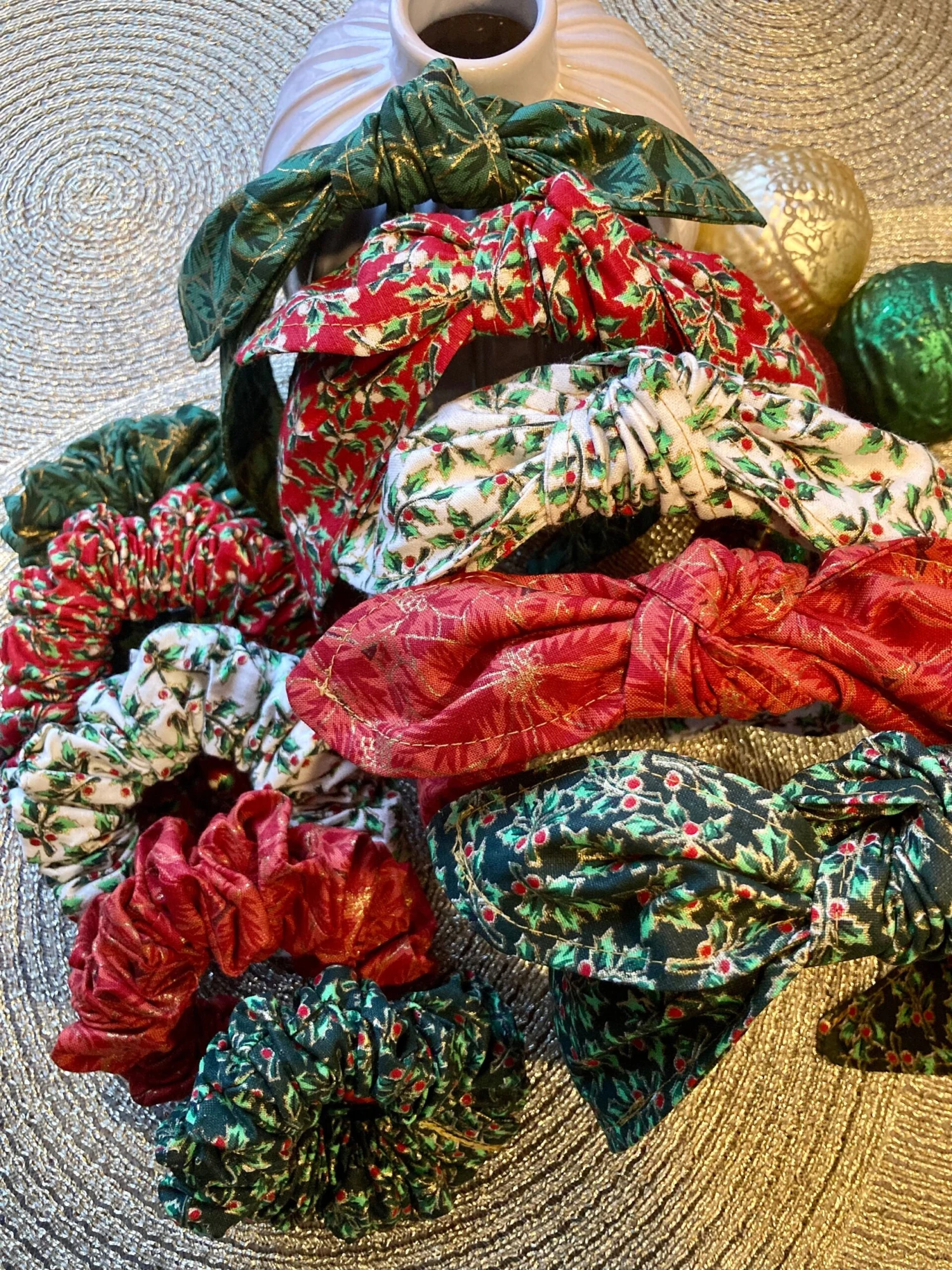 Beautiful Christmas hair accessories in this collection there are bow headbands to choose from and a coordinating scrunchie set! These stunning hair accessories are essential to keep the hair out of the way and adding a burst of pattern to any outfit!