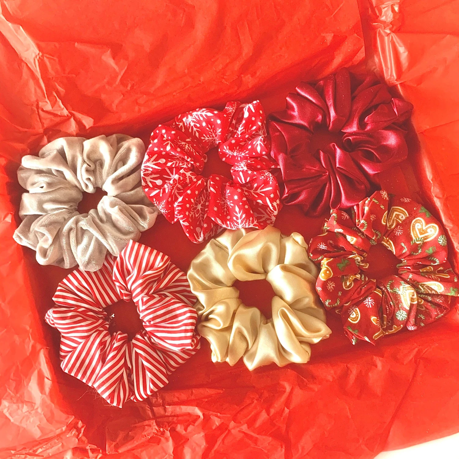 All scrunchies are handmade on site and are made with Christmas themed patterns and fabrics; reds, golds, velvets, satins etc.