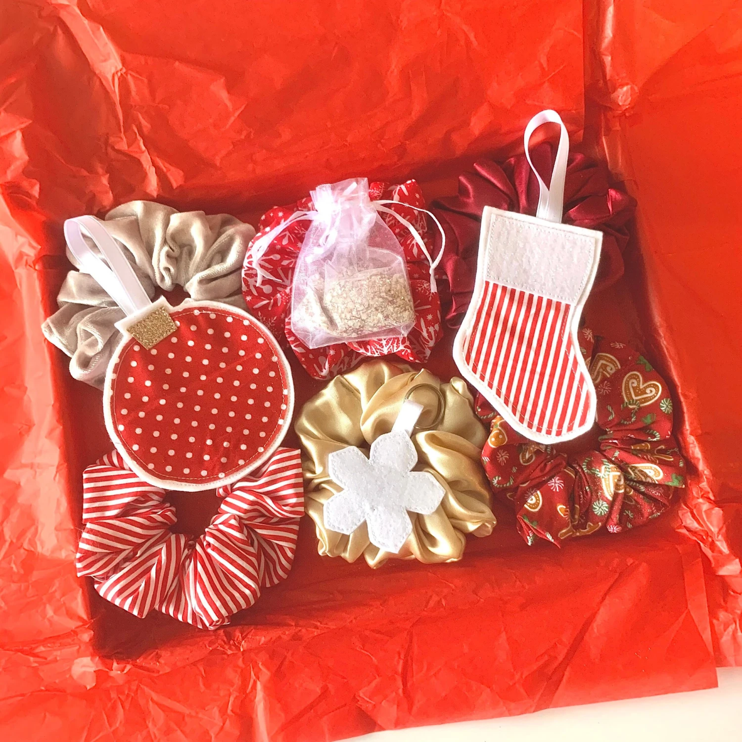Mystery Christmas scrunchie box with handmade scrunchies.