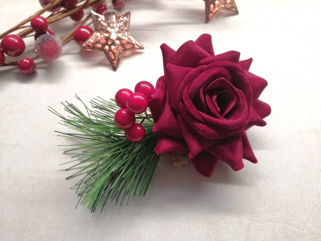 The flower, berries, cone and greenery are attached to an alligator style clip that measures 5.5cm in length – the overall measurement of the Christmas hair flower is 11x7cm with a height of 3.5cm (at the widest points) whilst the rose has a diameter of approximately 7cm.