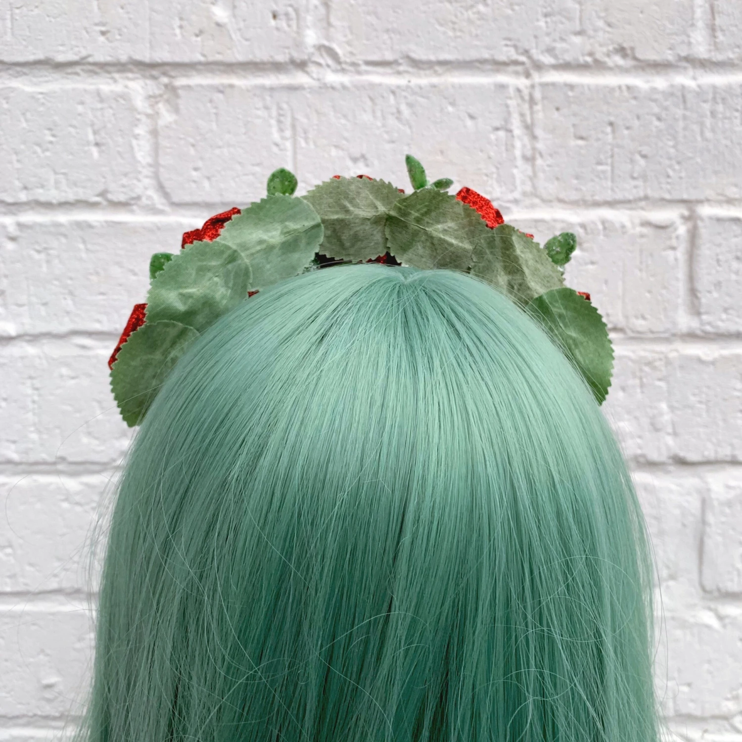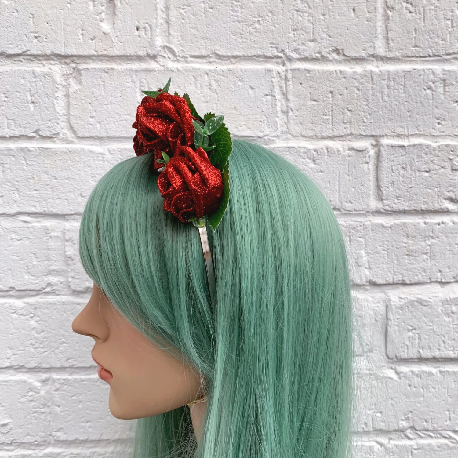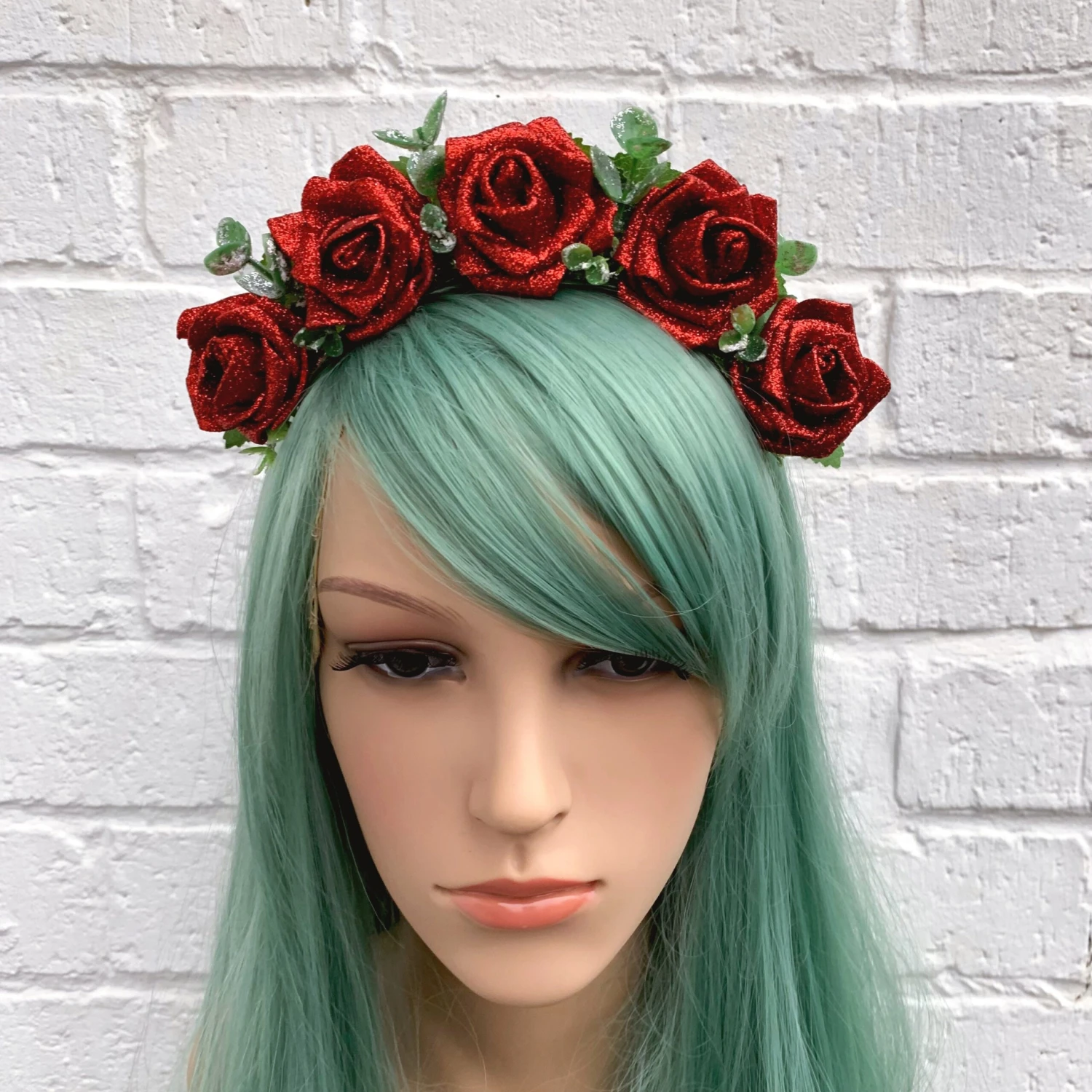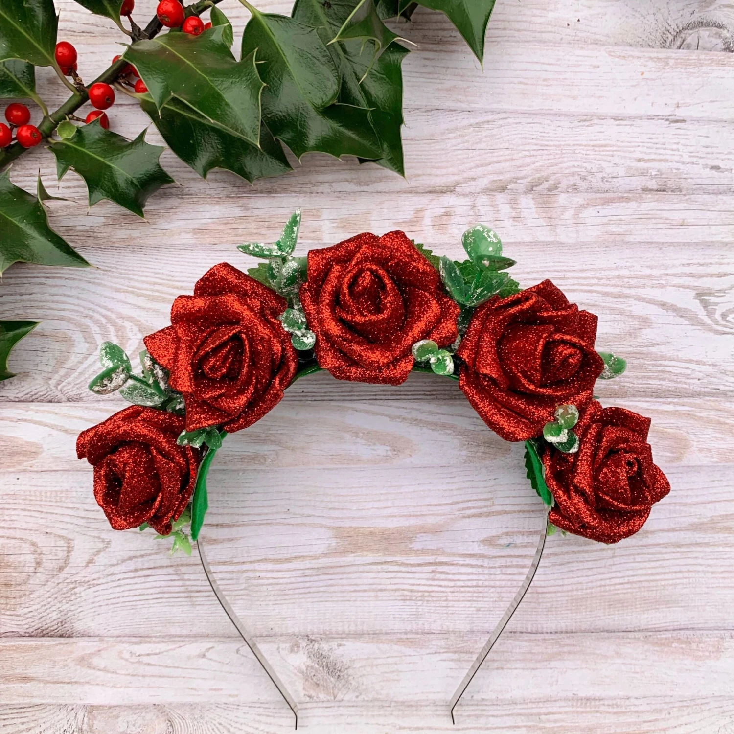 Be the star of any New Year’s Eve party with this red glitter rose headband. The roses are very sparkly and are surrounded by lovely green foliage.