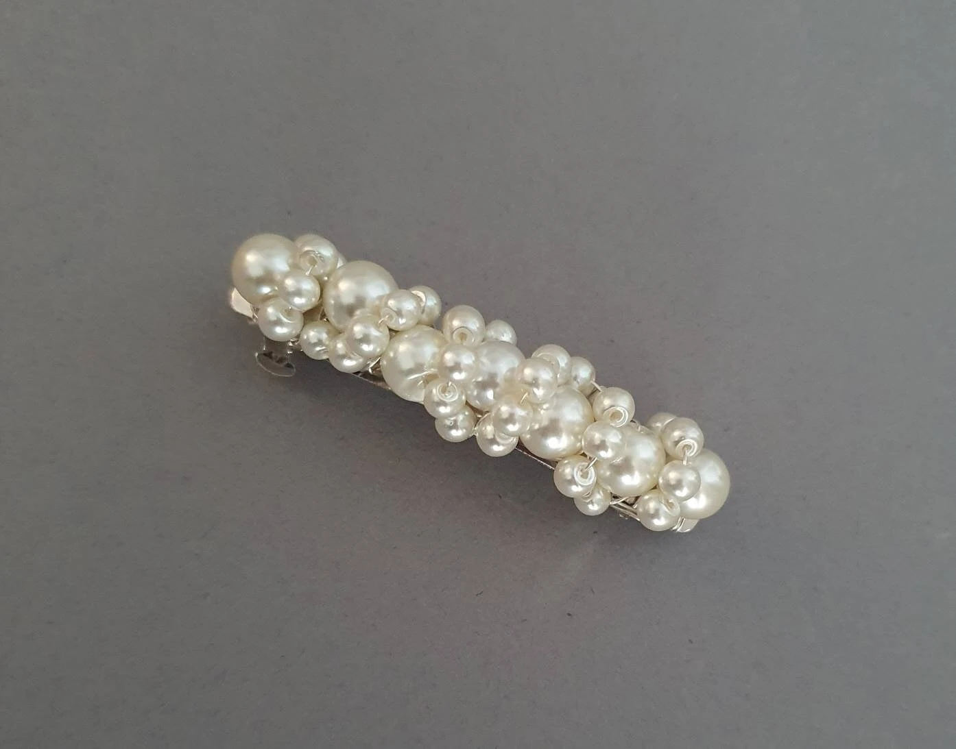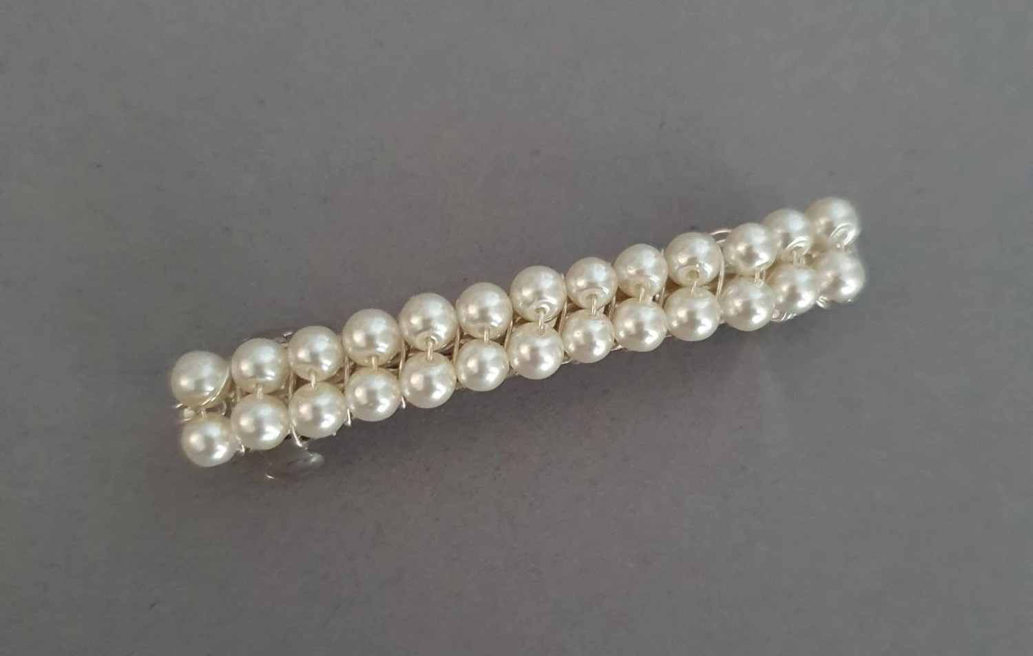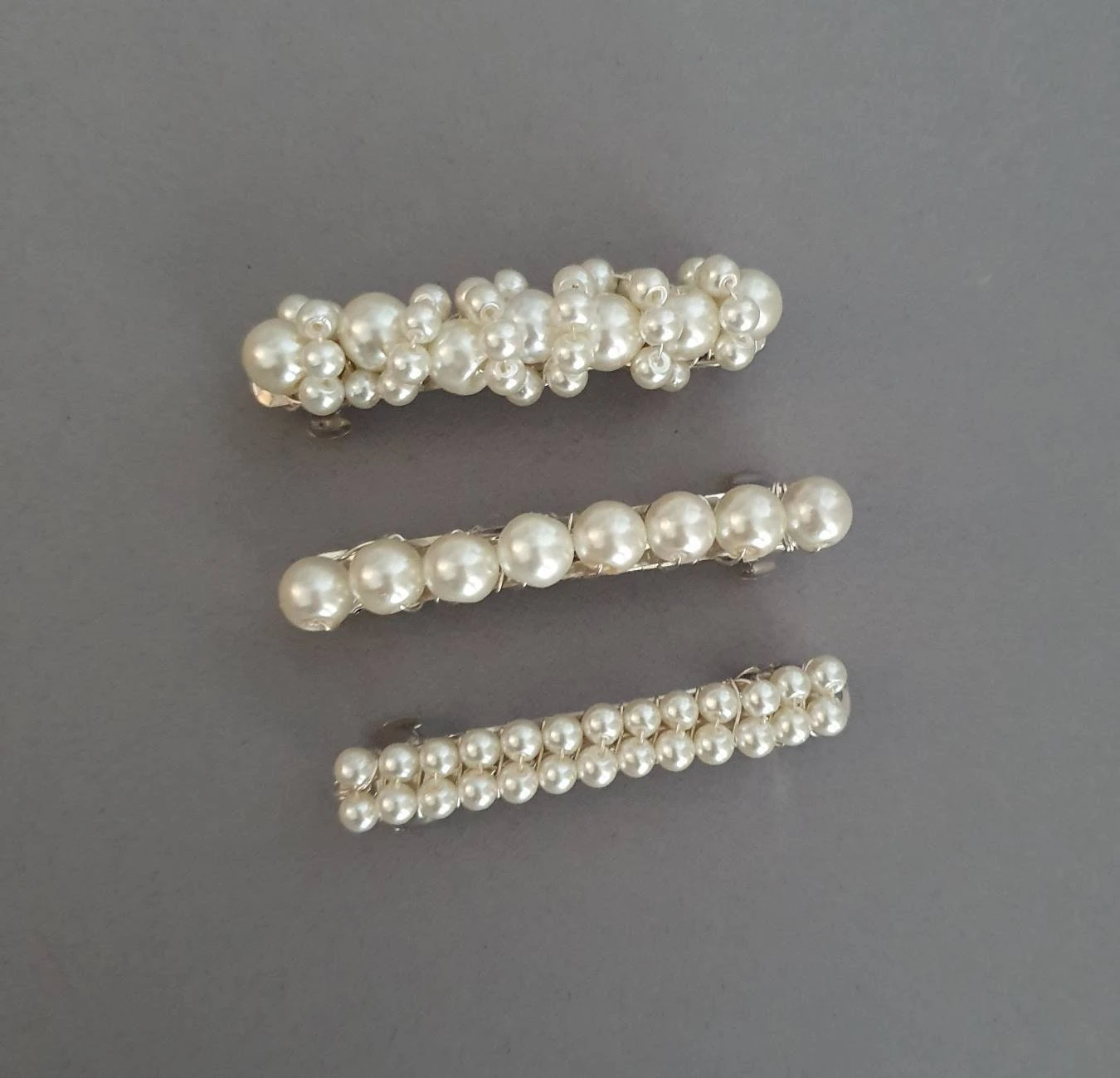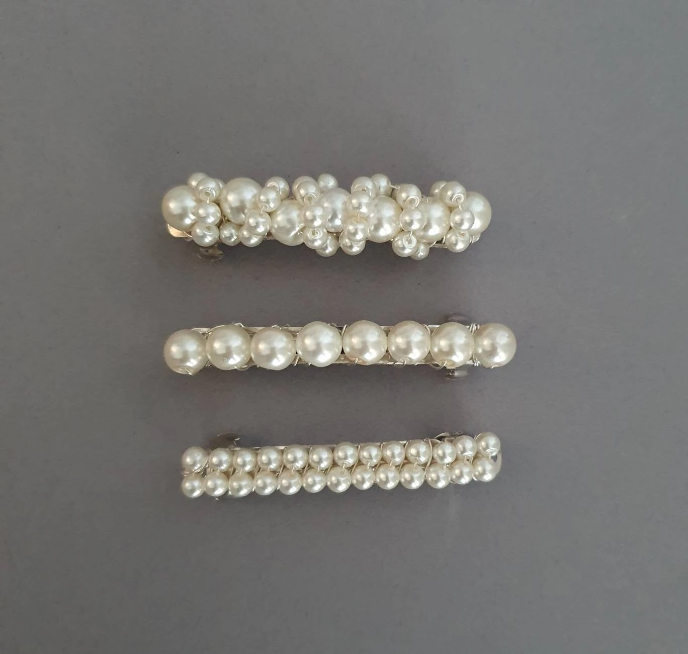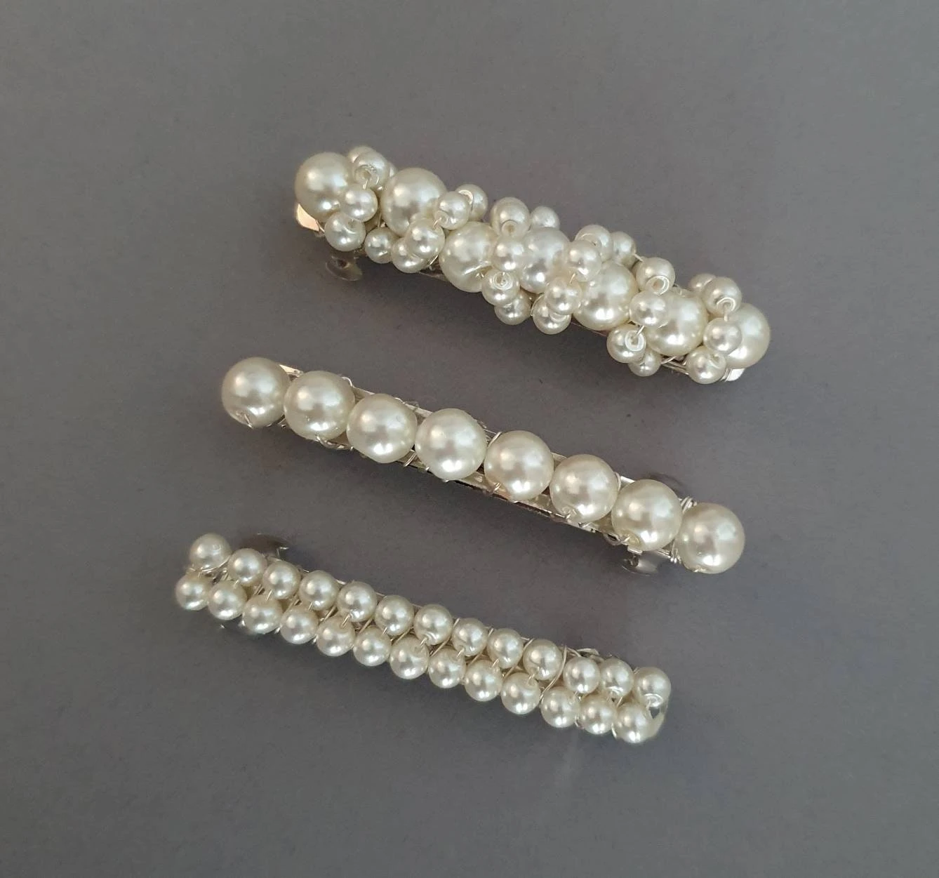 A set of 3 pearl hair barrettes. Pretty ivory glass pearl’s wired to silver barettes, each measuring approximately 6 cm each.