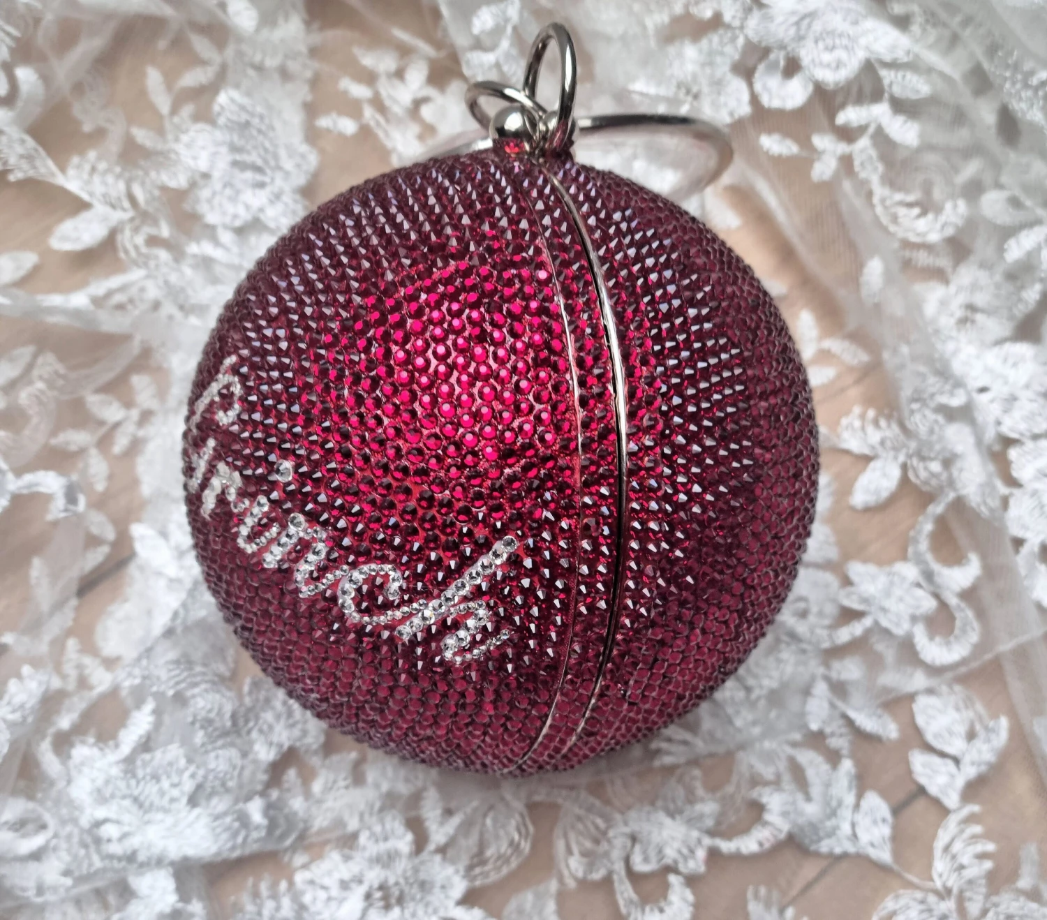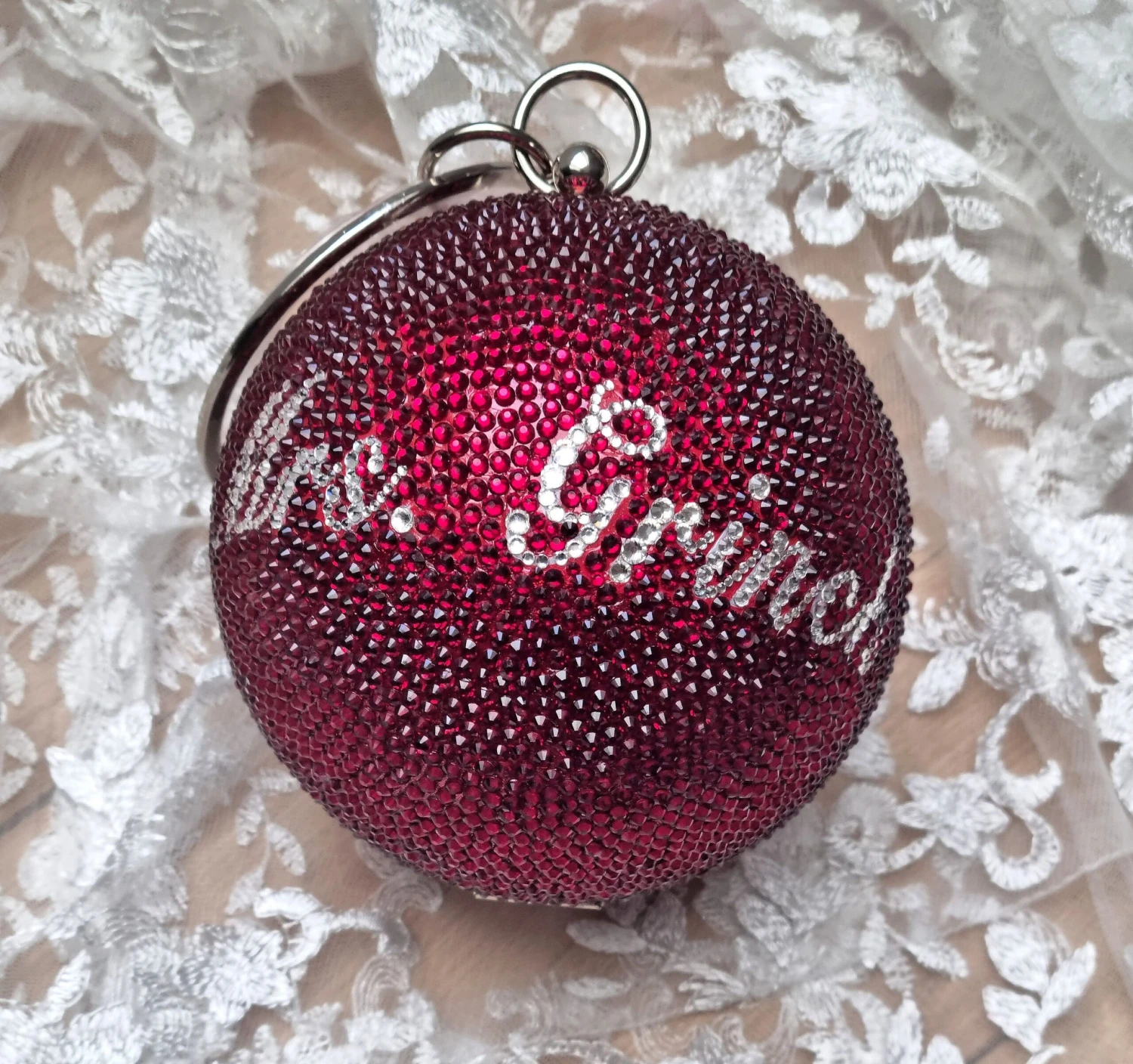 This exquisite hand crafted Swarovski ELEMENTS Crystal clutch has been adorned in a multitude of Burgundy Red crystals that all complement each other. There are over 3500 crystals that have been personalized into a “Mrs Grinch” Bauble christmas themed bag. The pictures do not do this item justice!