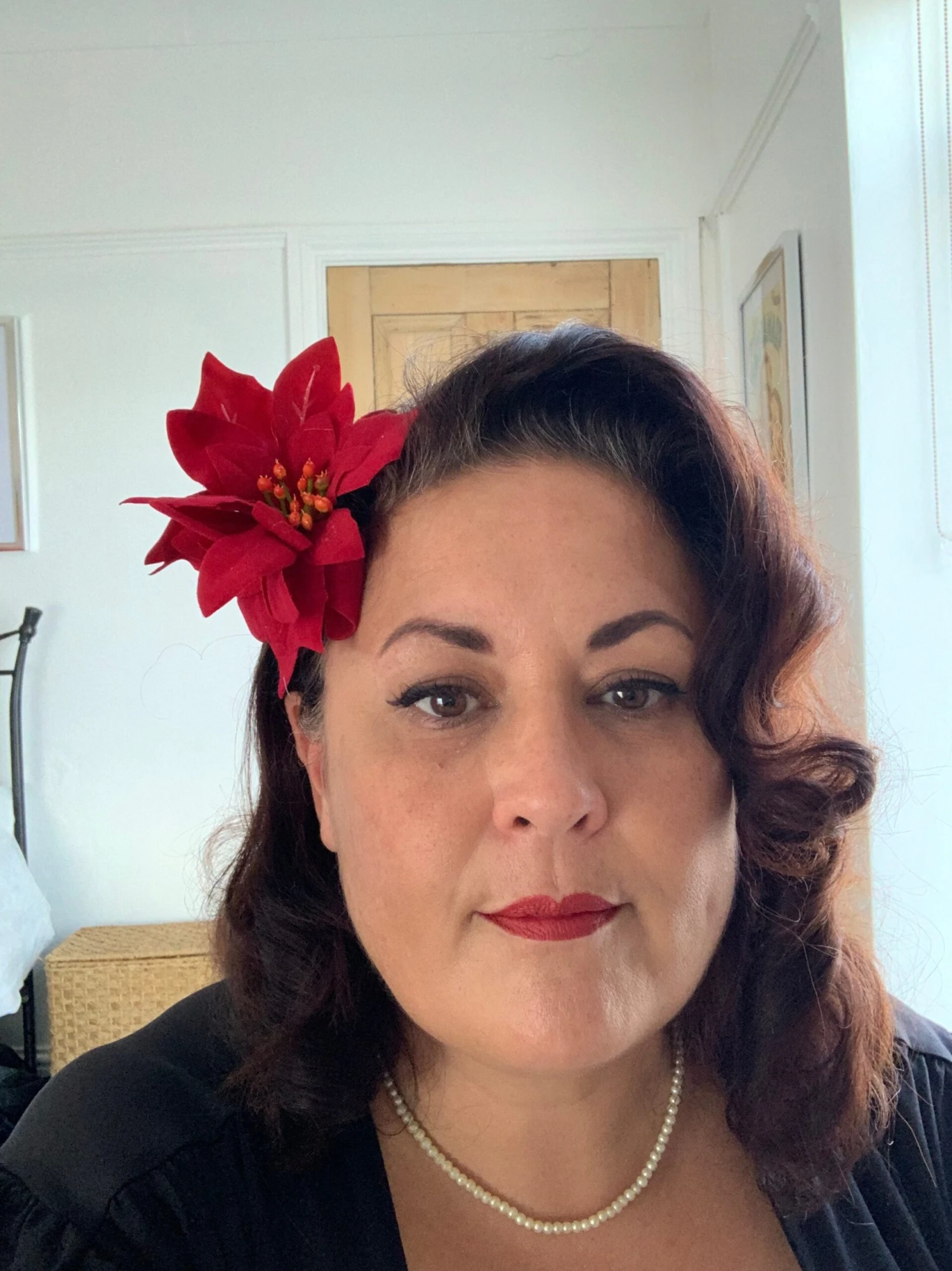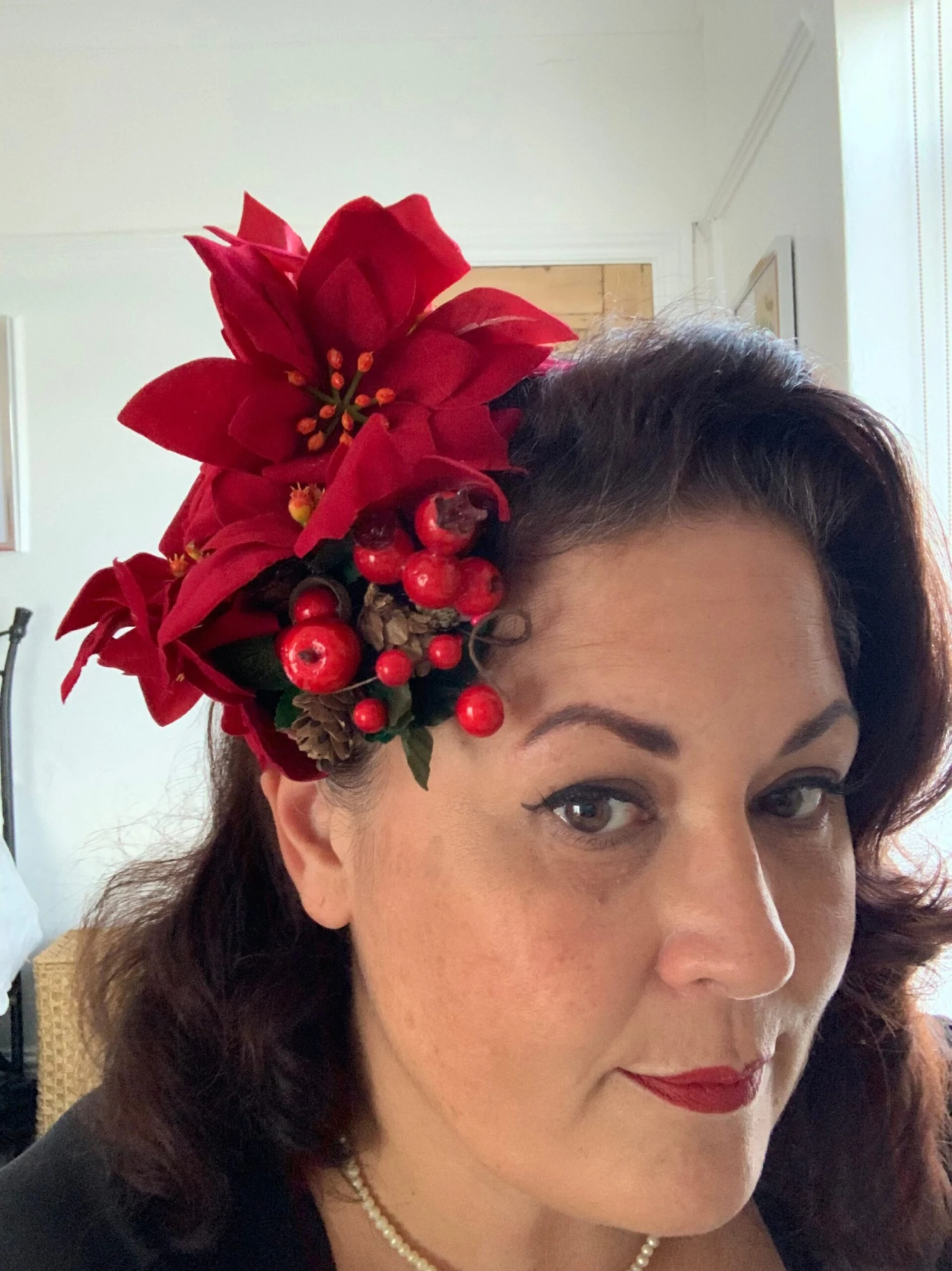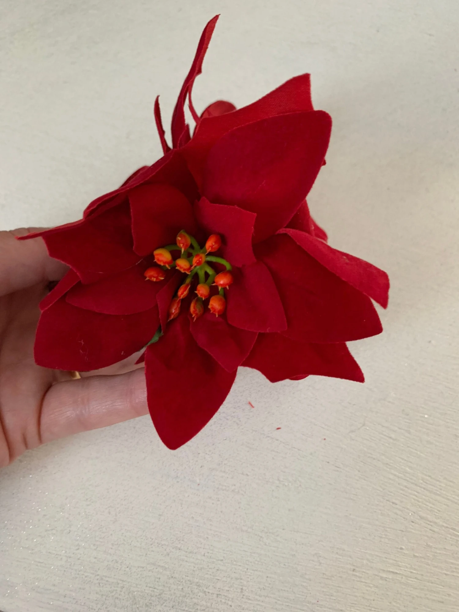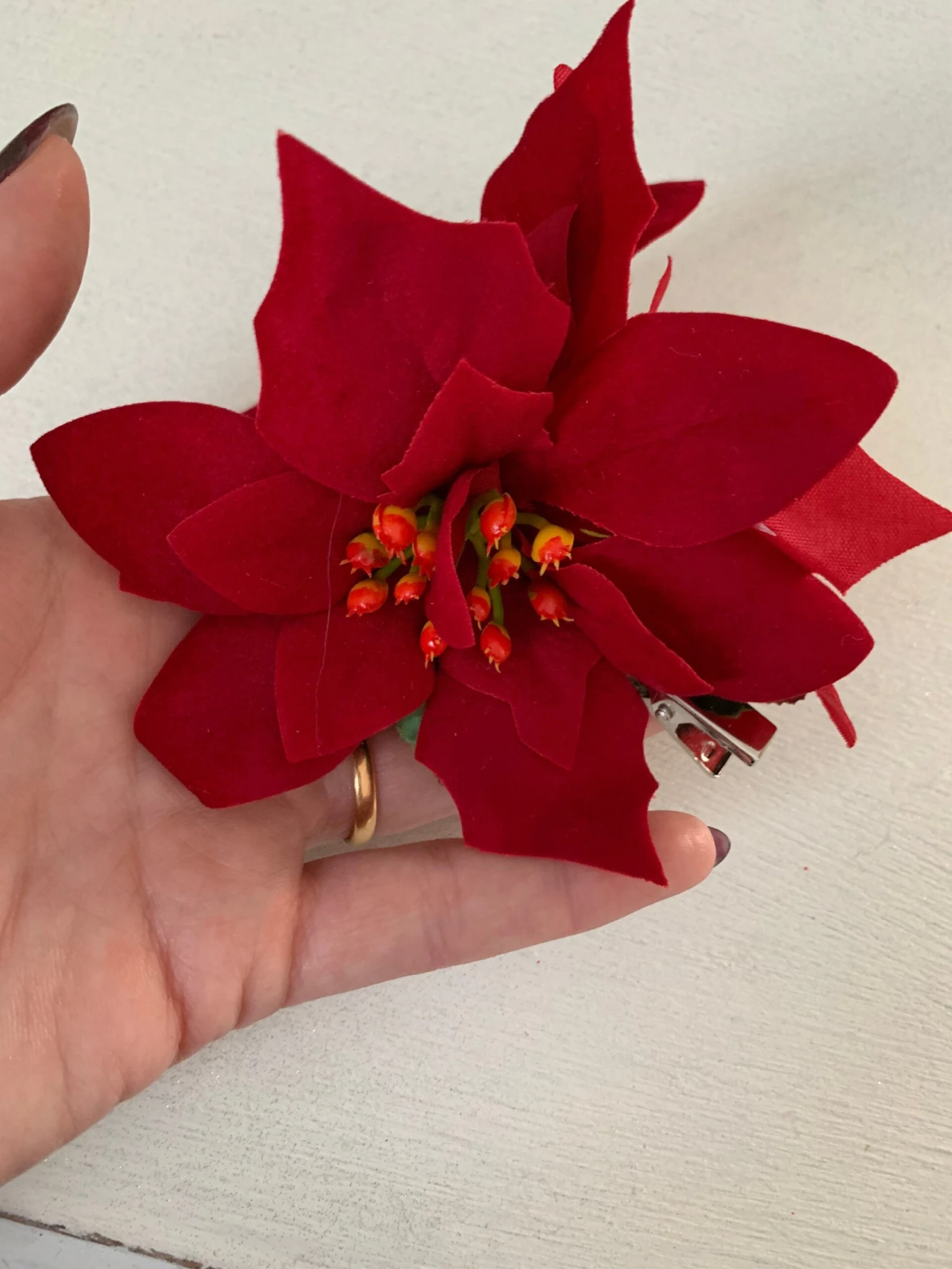 Three deep red poinsettia silk flowers on a felt base with a crocodile clip to attach to your hair.