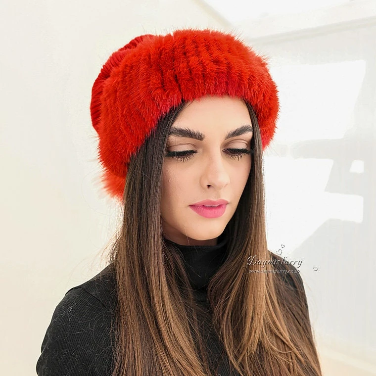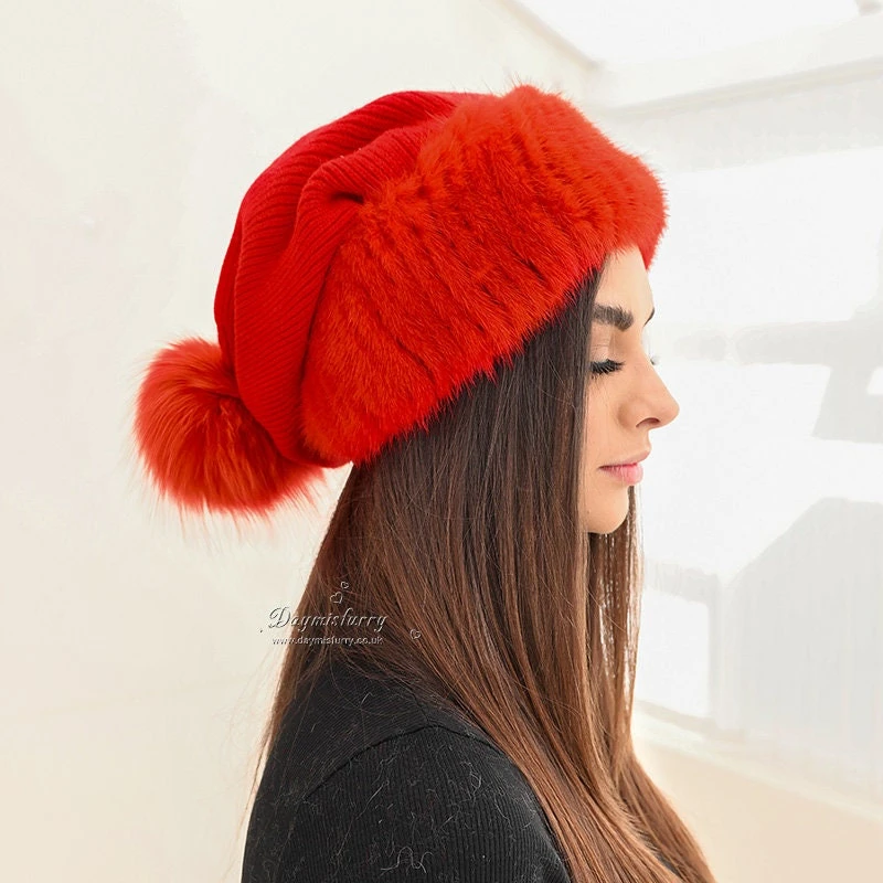 Wool Knit Hat With Fox Fur Ball And Mink Fur Trim, Christmas Hat, Santa Hat, Winter Hat, Fashion Hat